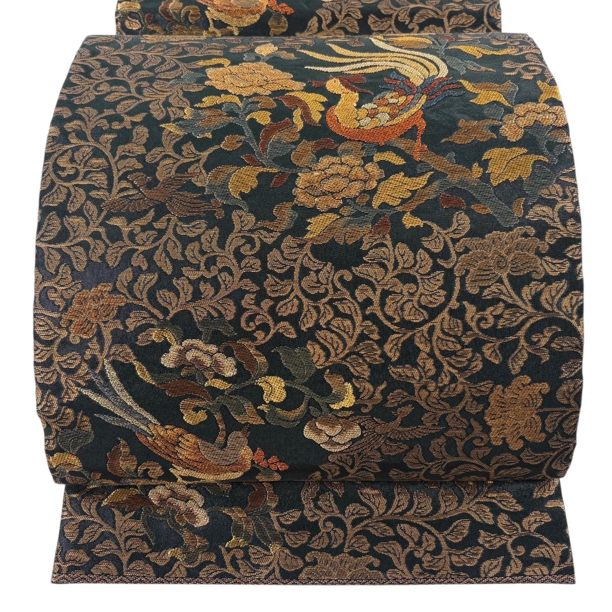 袋帯 逸品 紋屋井関 落款あり 御寮織 花唐草 鳳凰 金糸 箔 深緑 六通 正絹