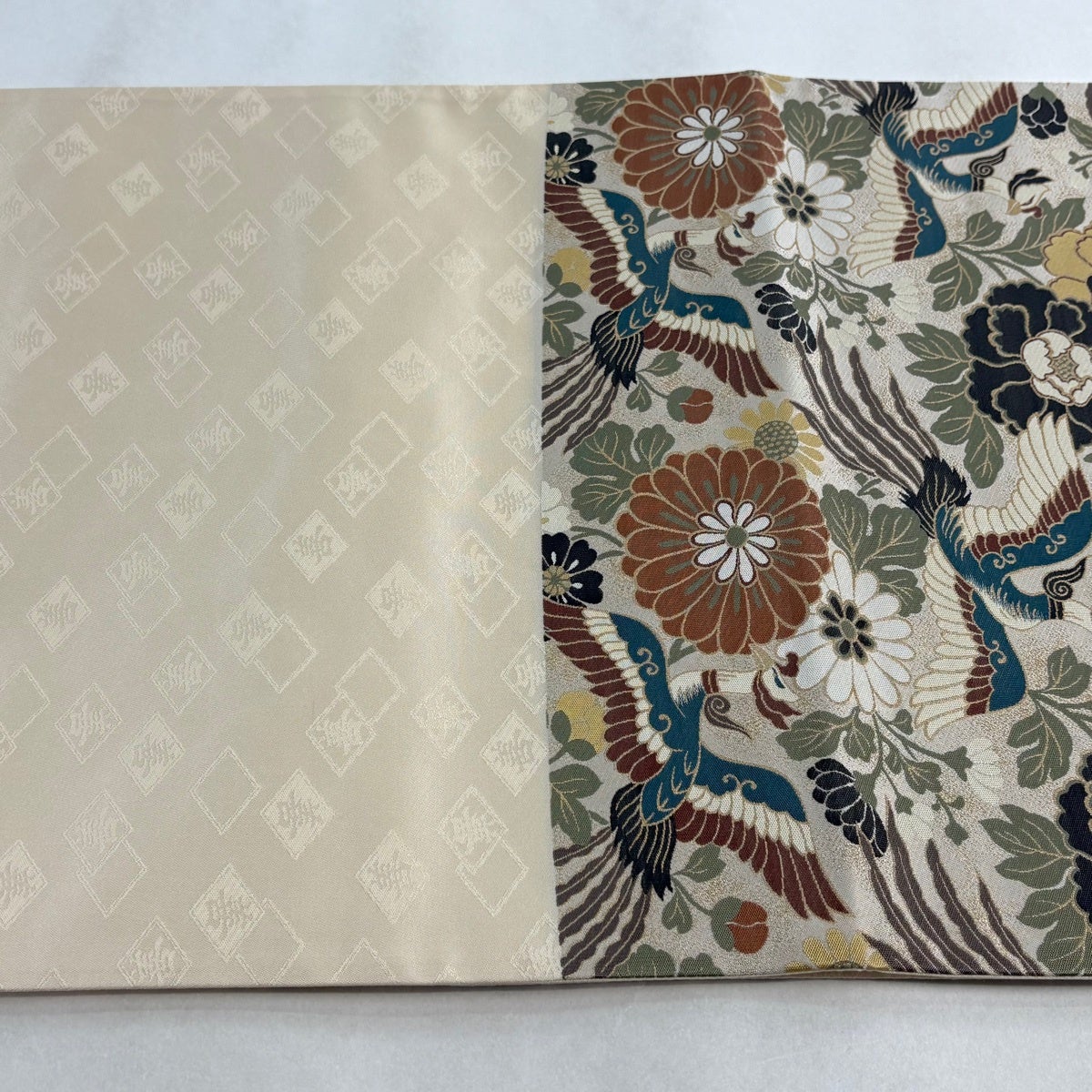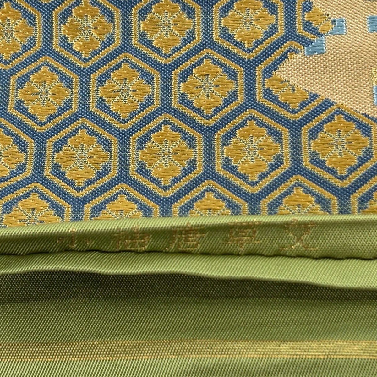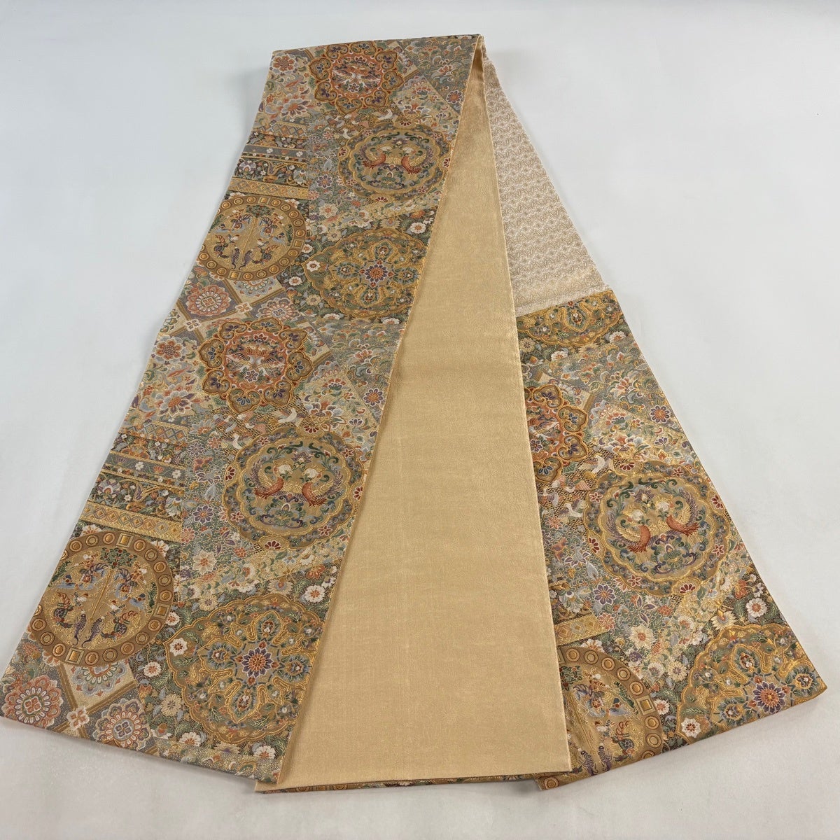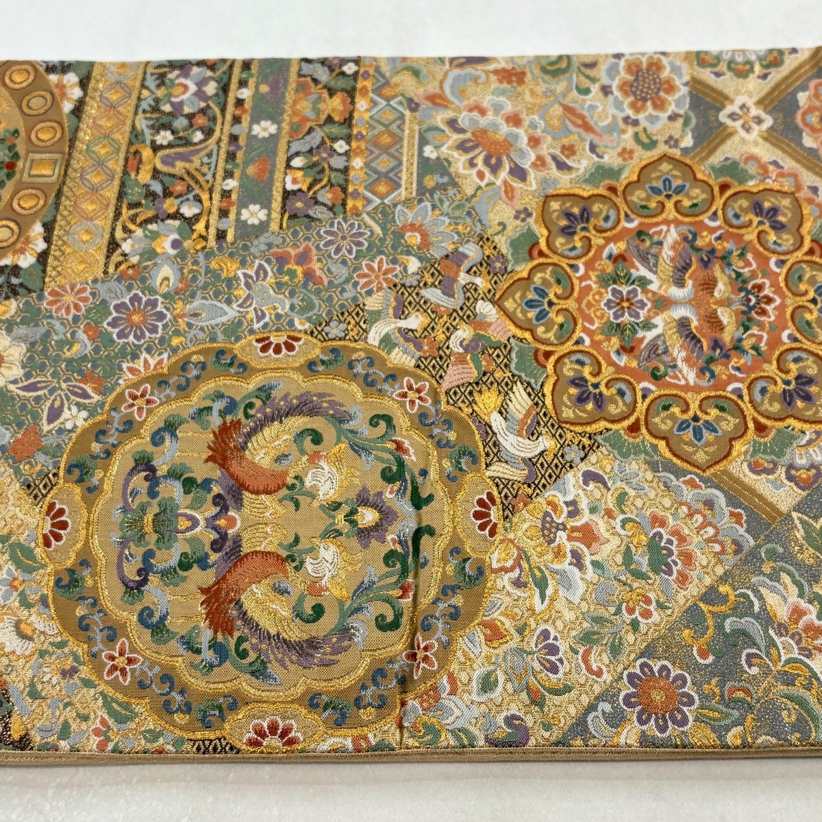 【美品】 袋帯 逸品 じゅらく 落款あり 向かい鳥 花菱 金糸 箔 金色 お太鼓柄 正絹