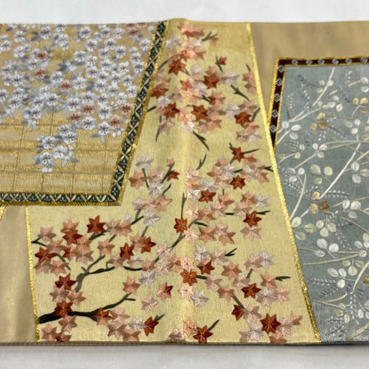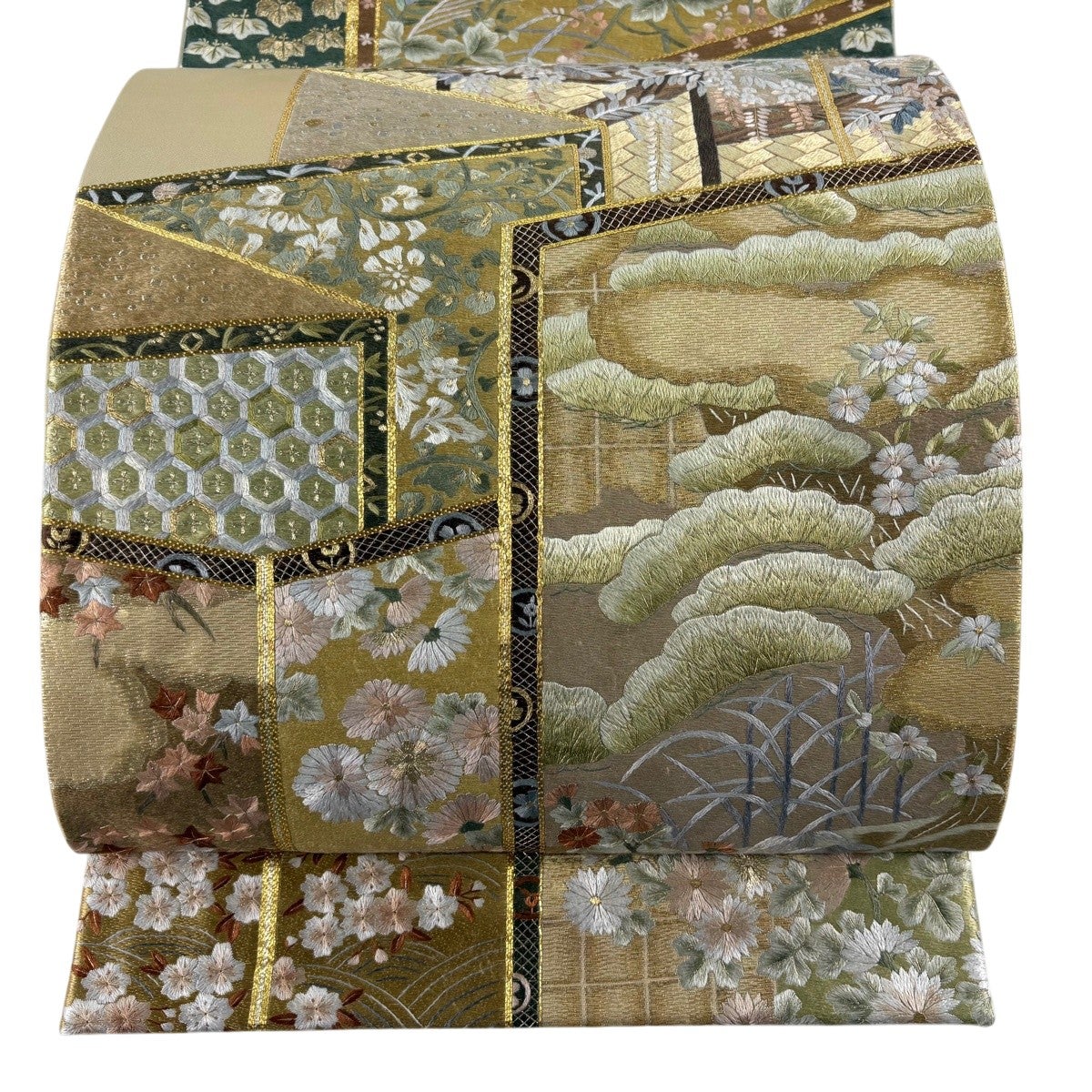 【美品】 袋帯 逸品 松竹梅 楓 抹茶色 全通 正絹