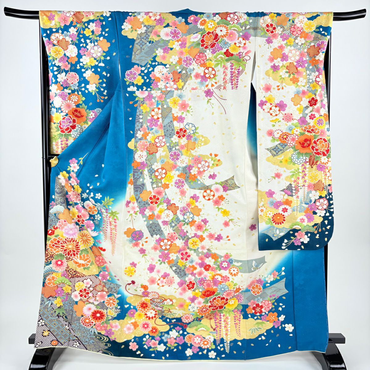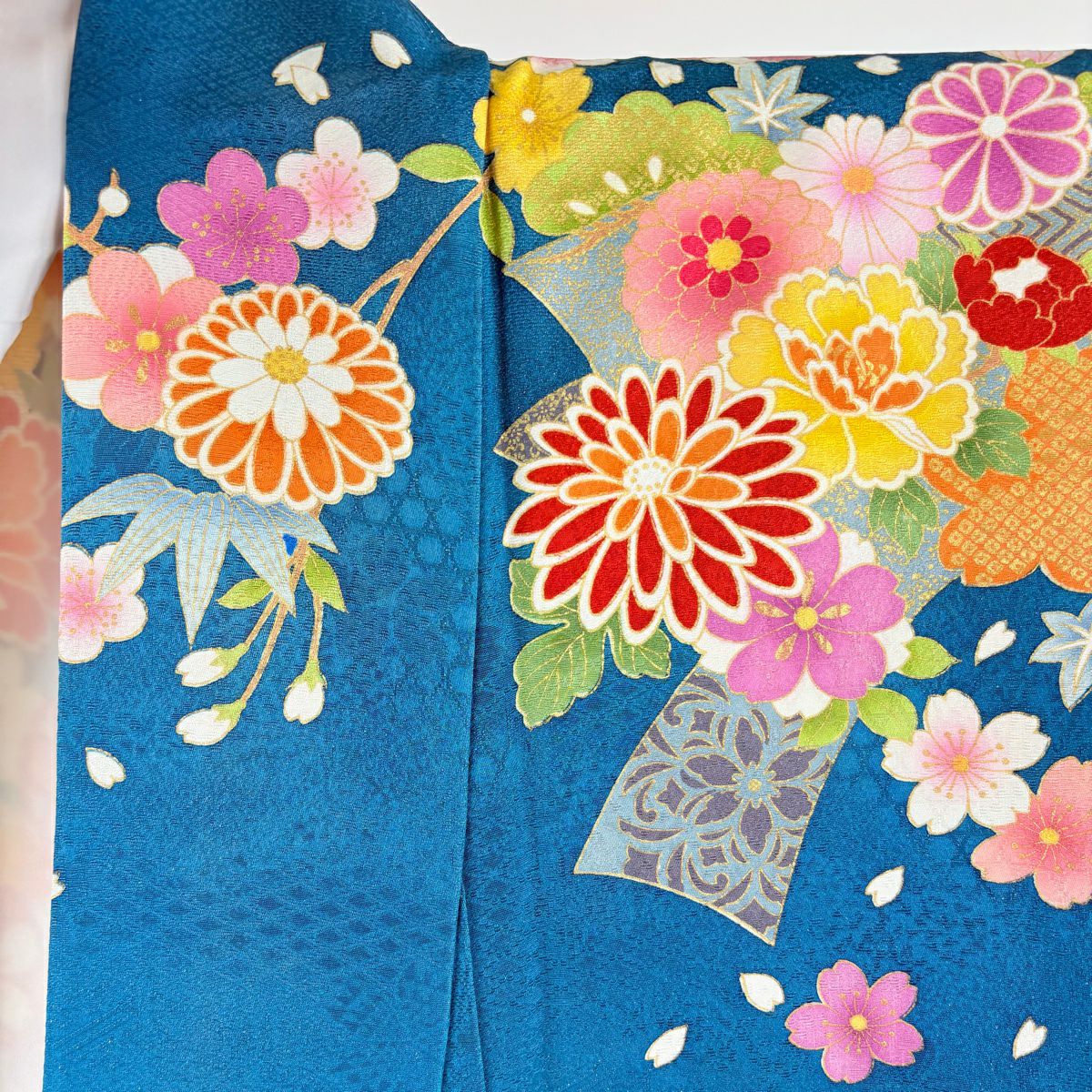 他の画像を見る 【最終値引き】 70%OFF 【美品】 振袖 身丈169.5cm 裄丈68cm L 袷 菊 短冊 金糸 銀通し 青緑 正絹 逸品 K70 当店通常価格 ¥ 38,800 ¥ 11,640 税込
