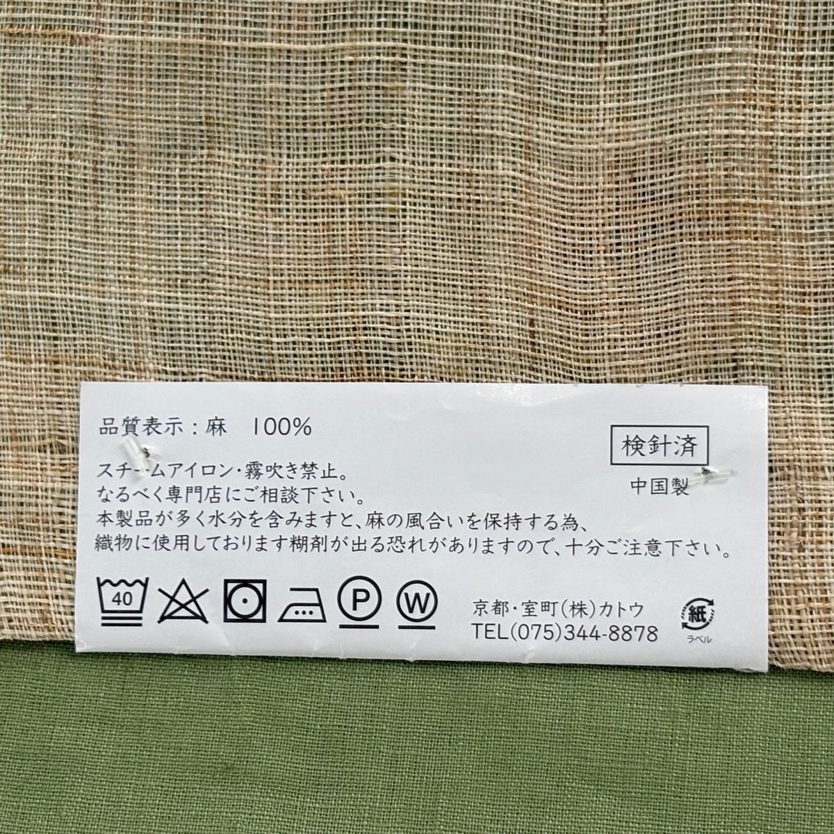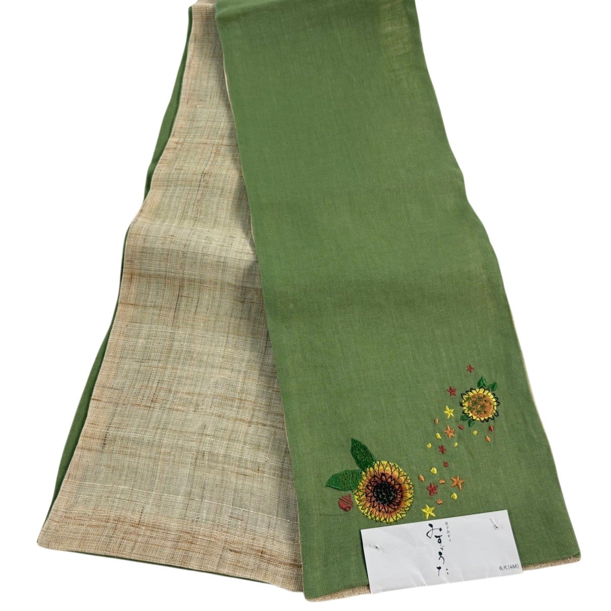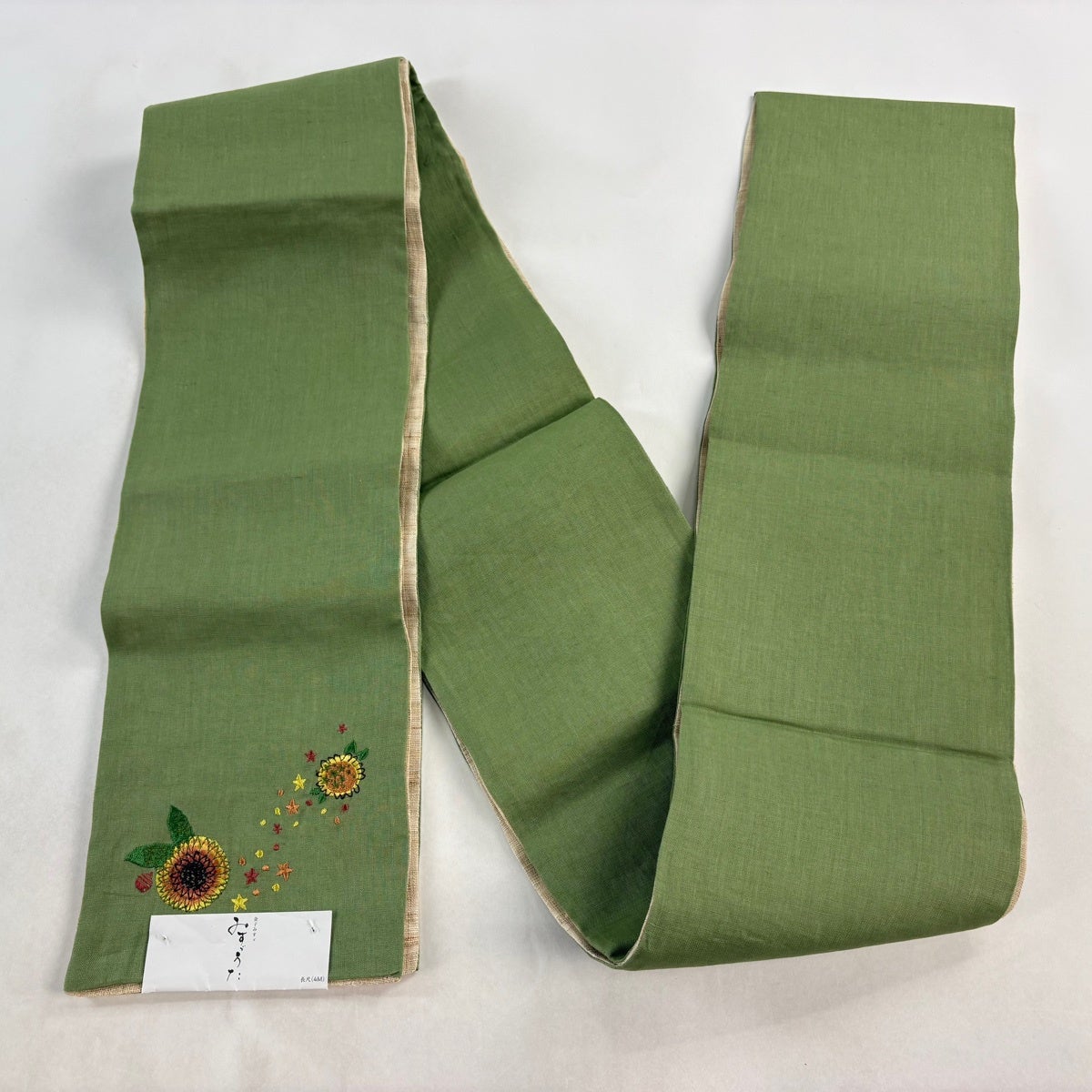 【美品】半幅帯 優品 草花 刺繍 薄緑 麻