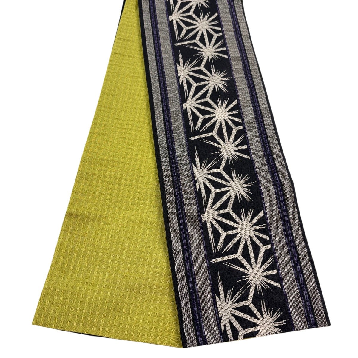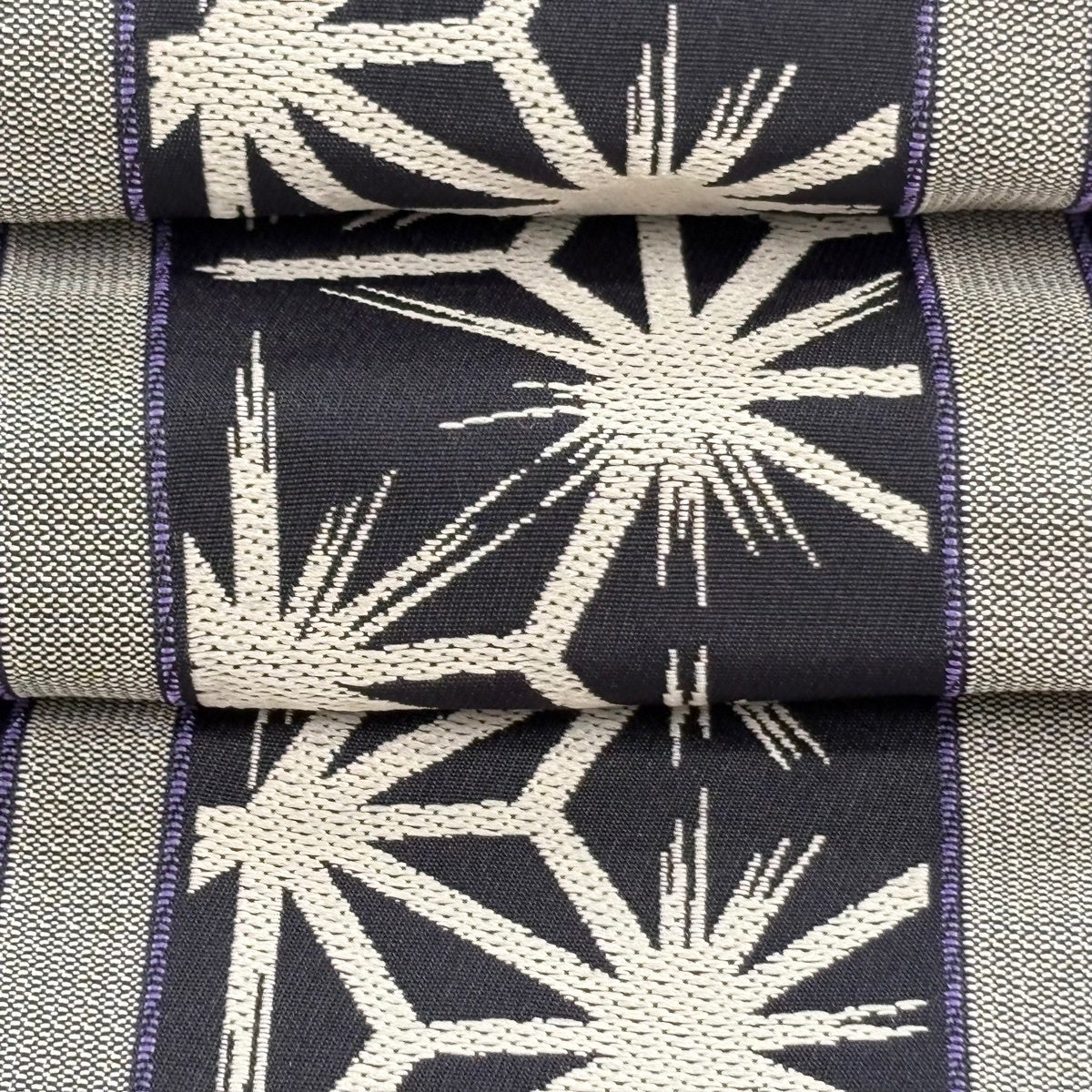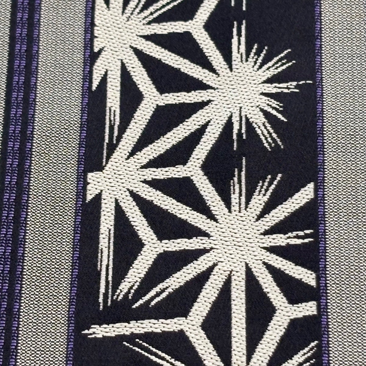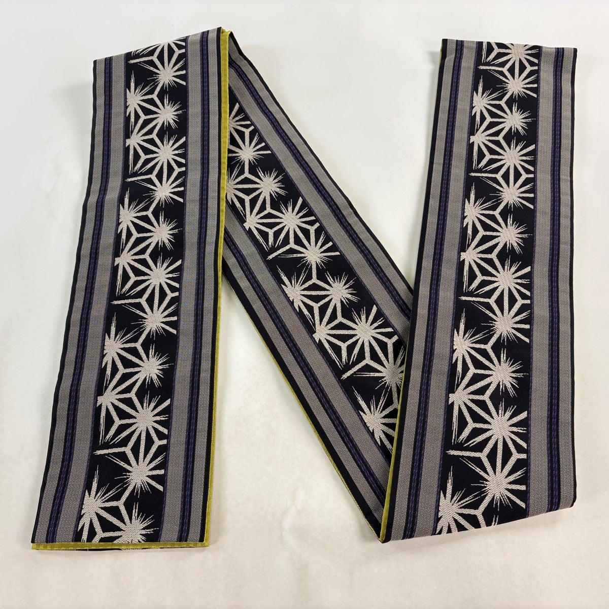 【美品】半幅帯 優品 麻の葉 縞 黒灰 化繊
