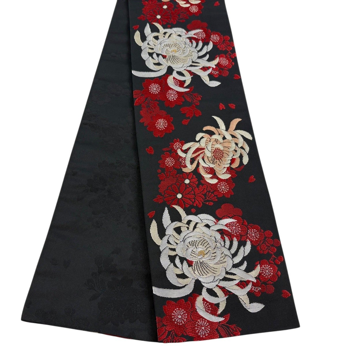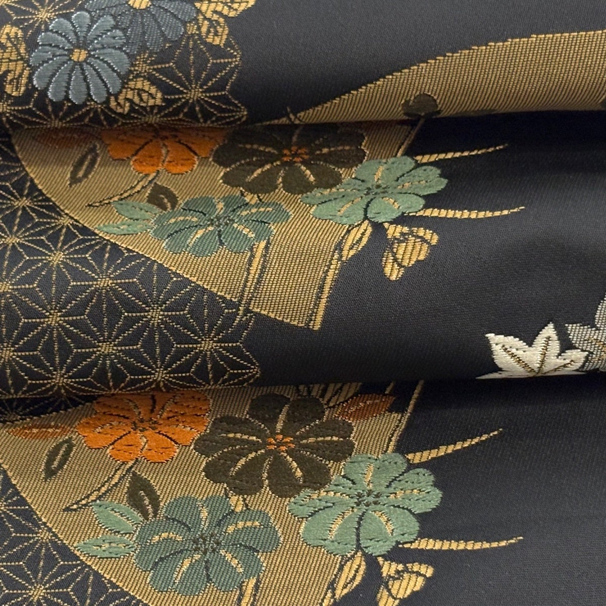 【美品】半幅帯 優品 菊 桜 箔 黒 化繊
