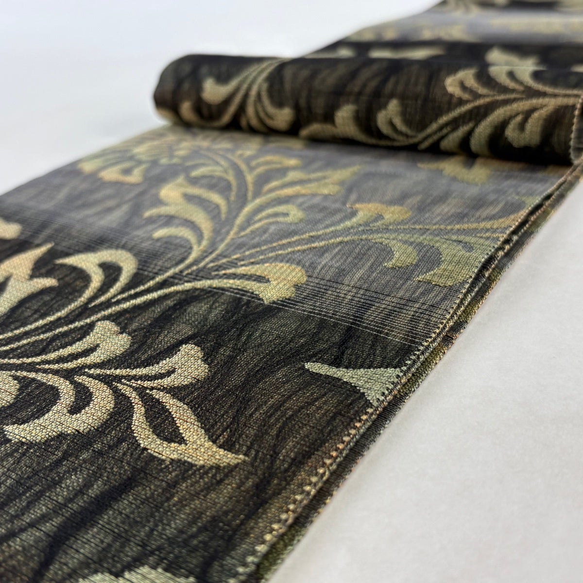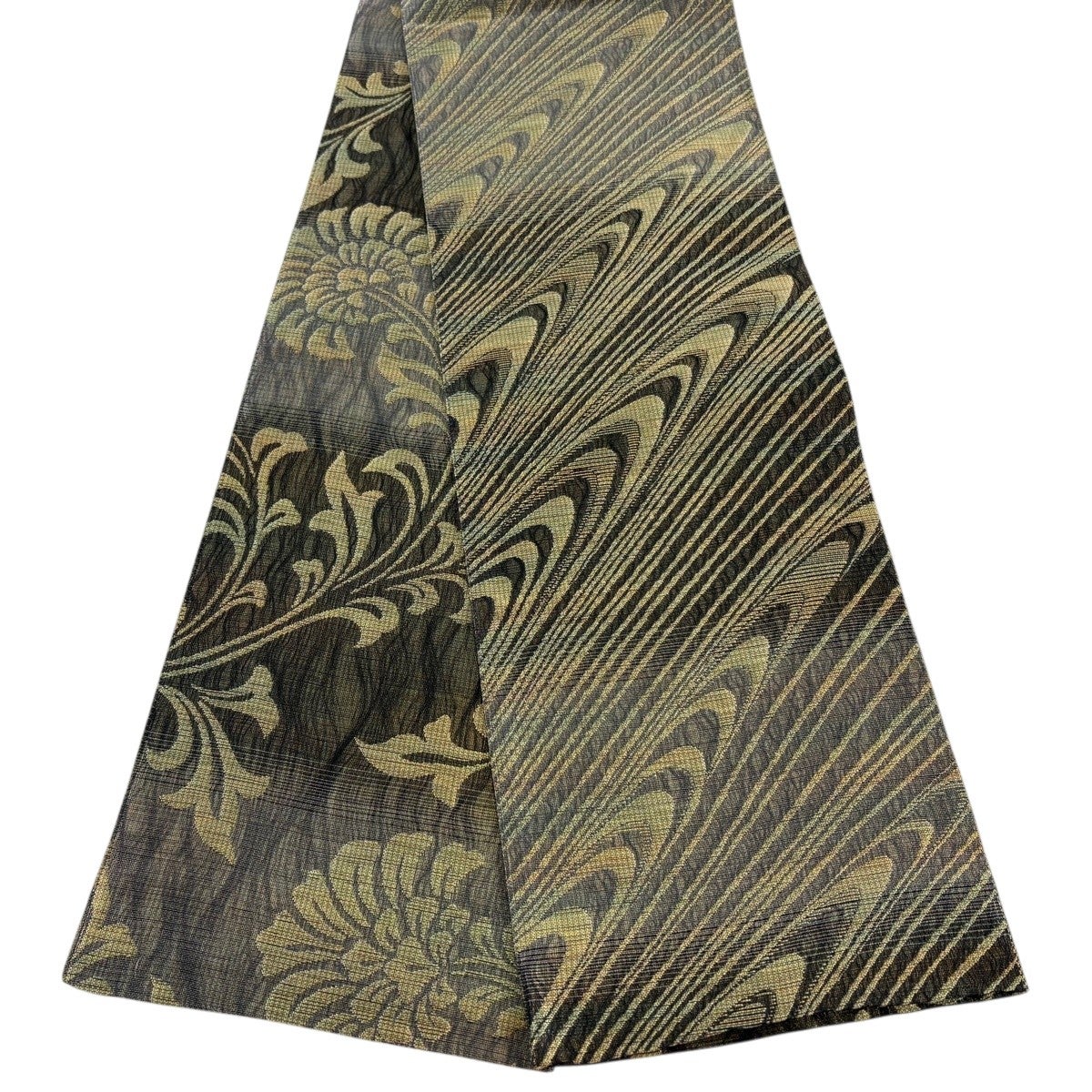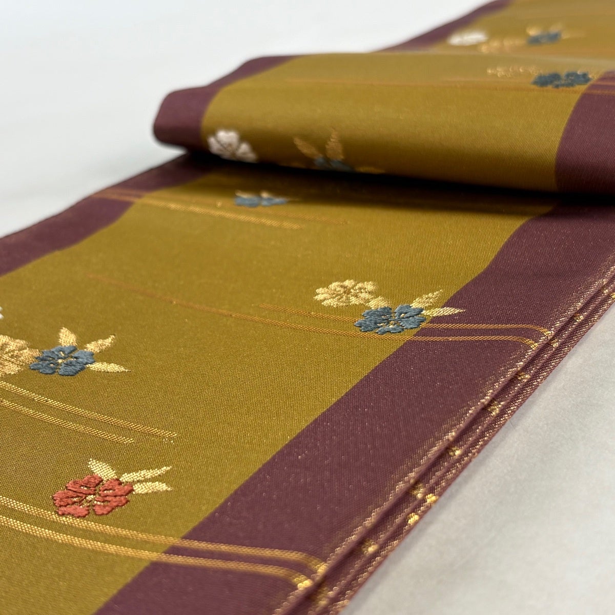 【美品】半幅帯 秀品 博多織 証紙 草花 縞 華詩織 茶緑色 正絹