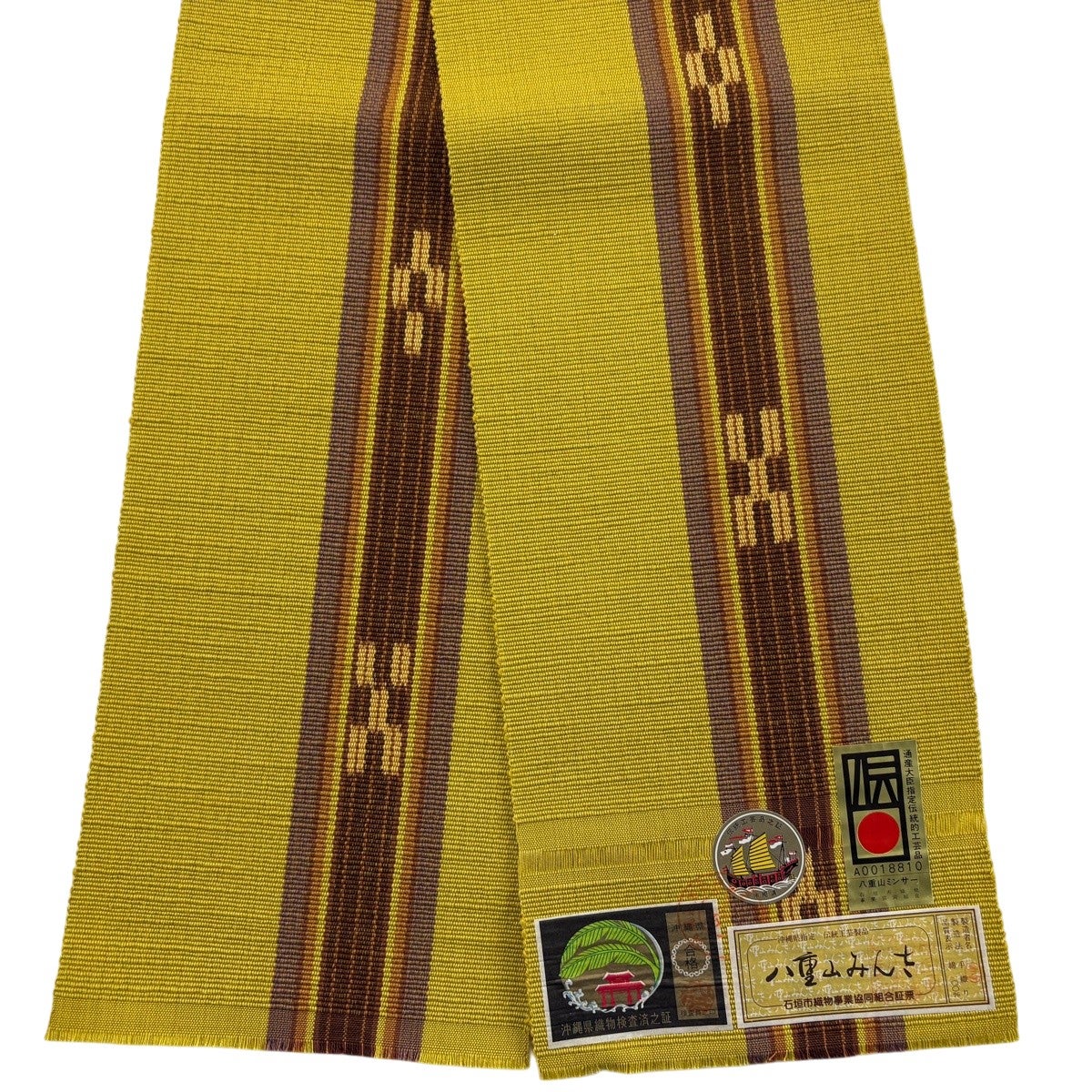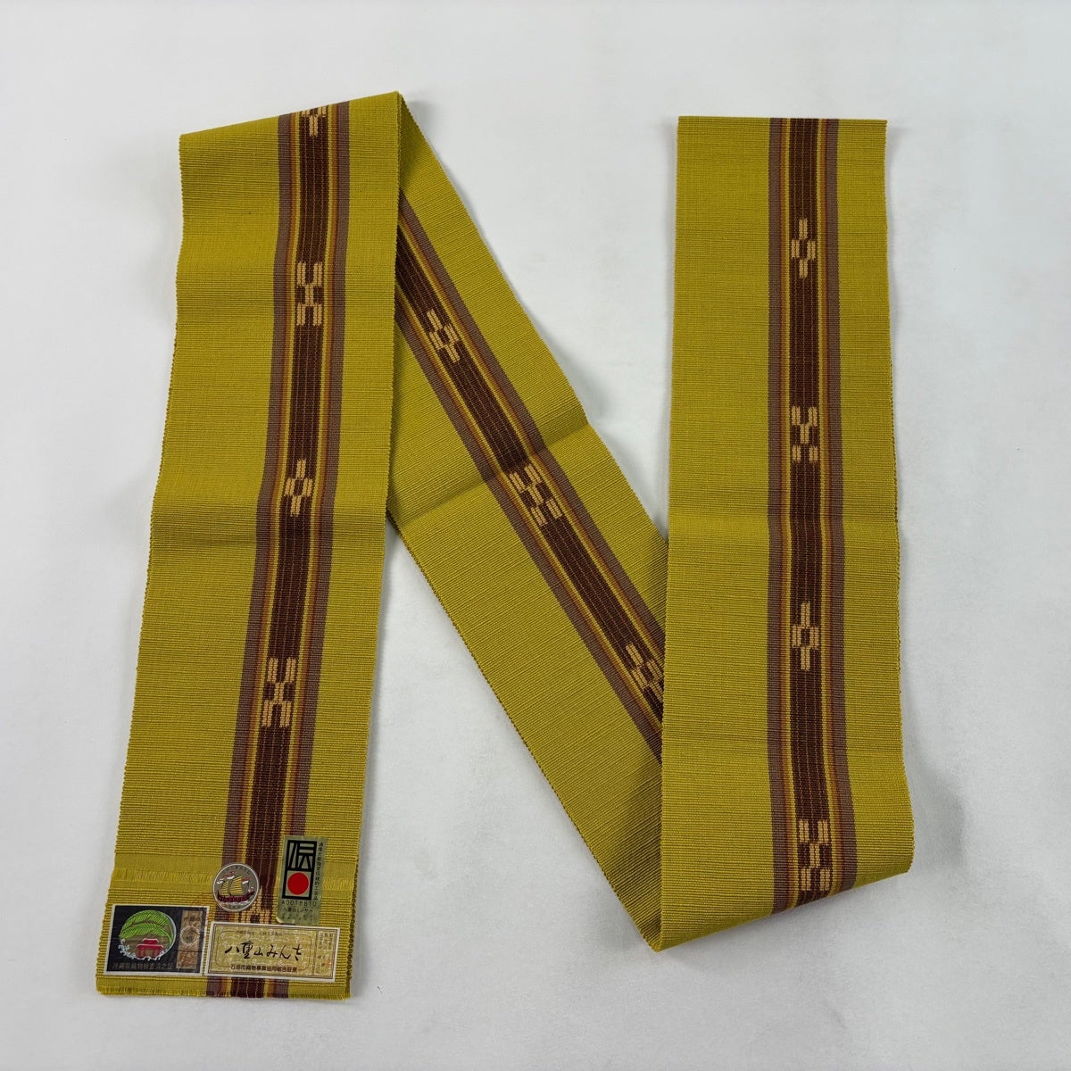 【美品】半幅帯 名品 八重山みんさ 証紙 植物染 幾何学 縞 山吹茶色 綿