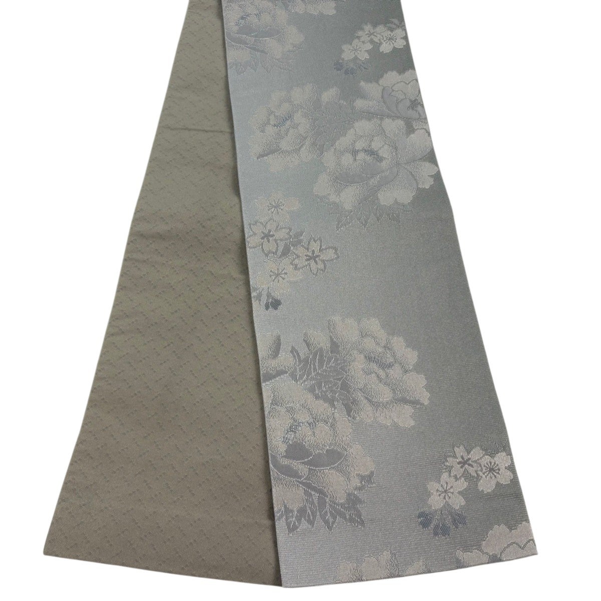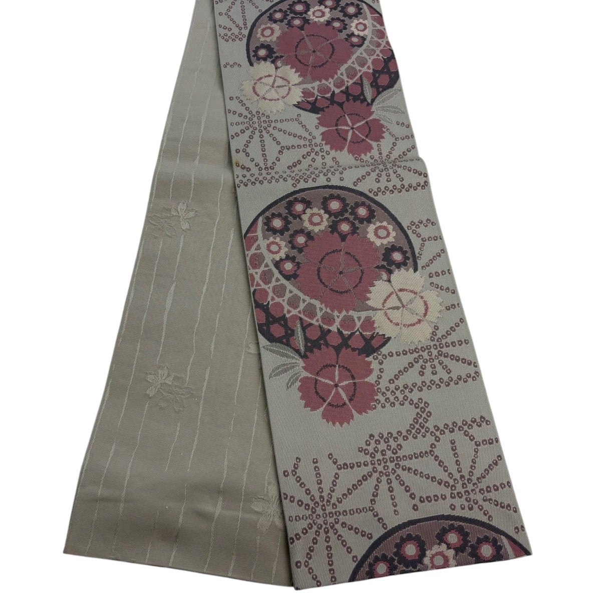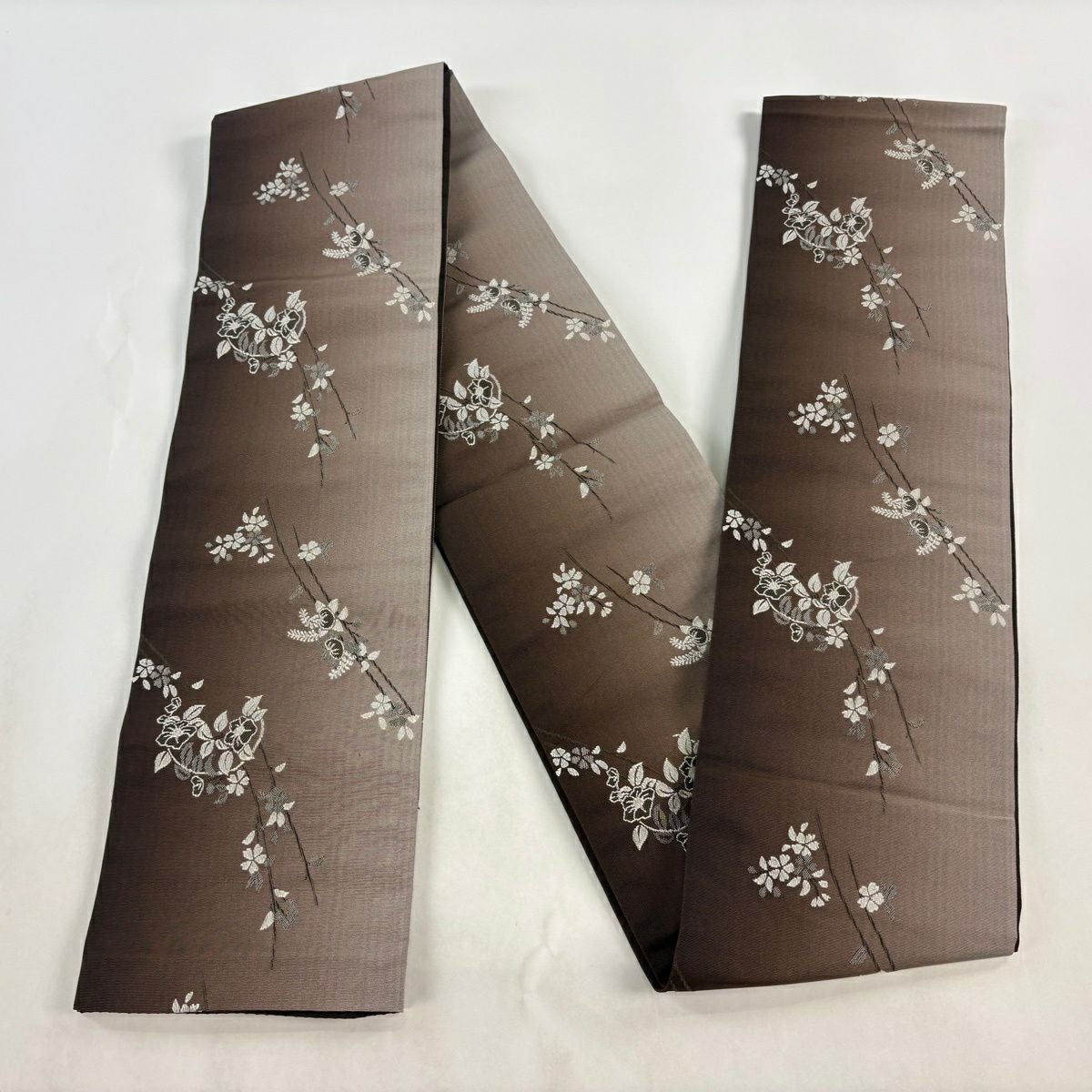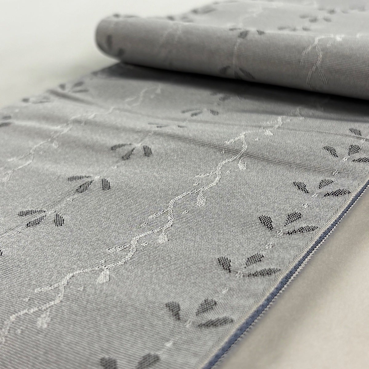 半幅帯 優品 草花 ぼかし 銀彩 灰色 化繊