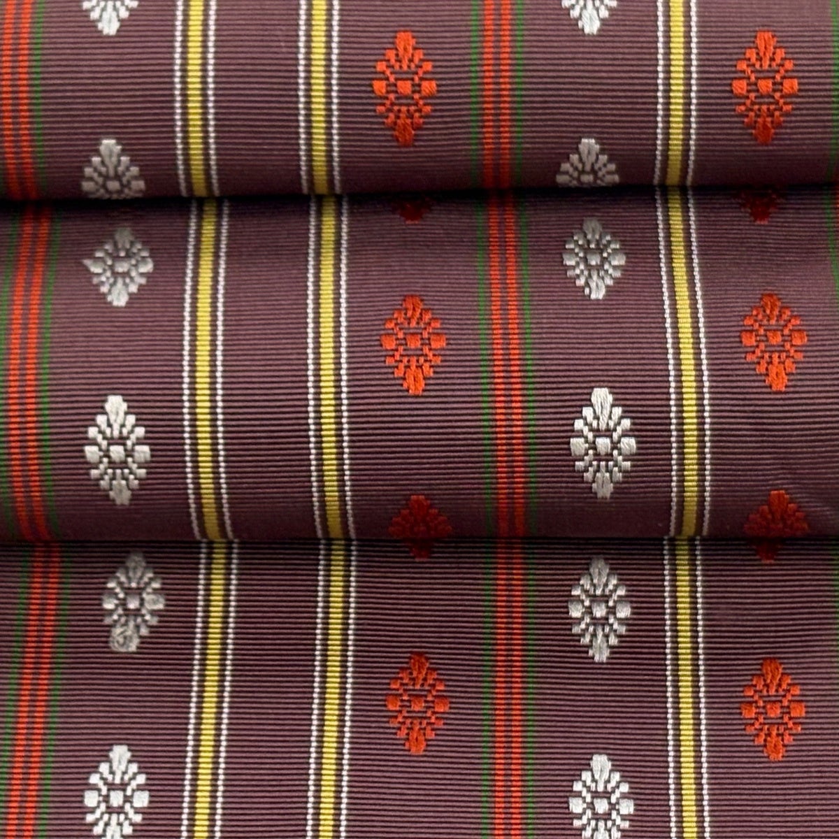 半幅帯 秀品 証紙あり 本場筑前博多織 縞 花菱 焦茶色 正絹