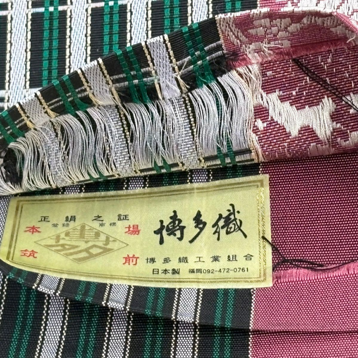 半幅帯 名品 博多織 証紙 花唐草 格子 黒 正絹