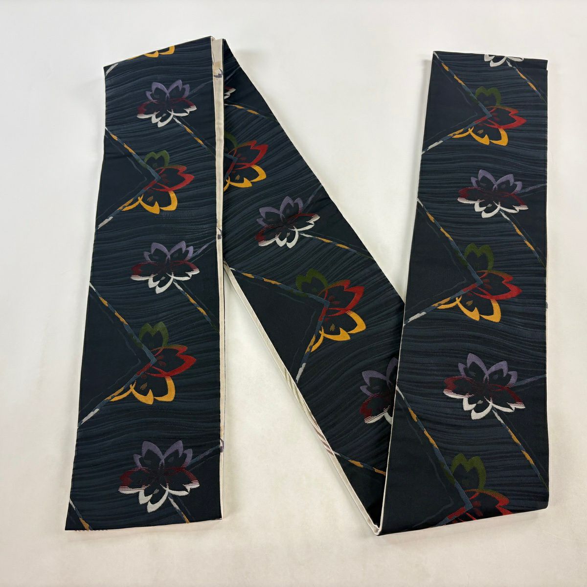 半幅帯 優品 桜 幾何学模様 濃紺 化繊