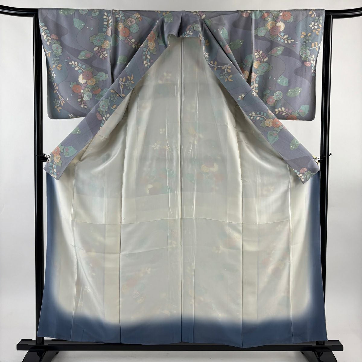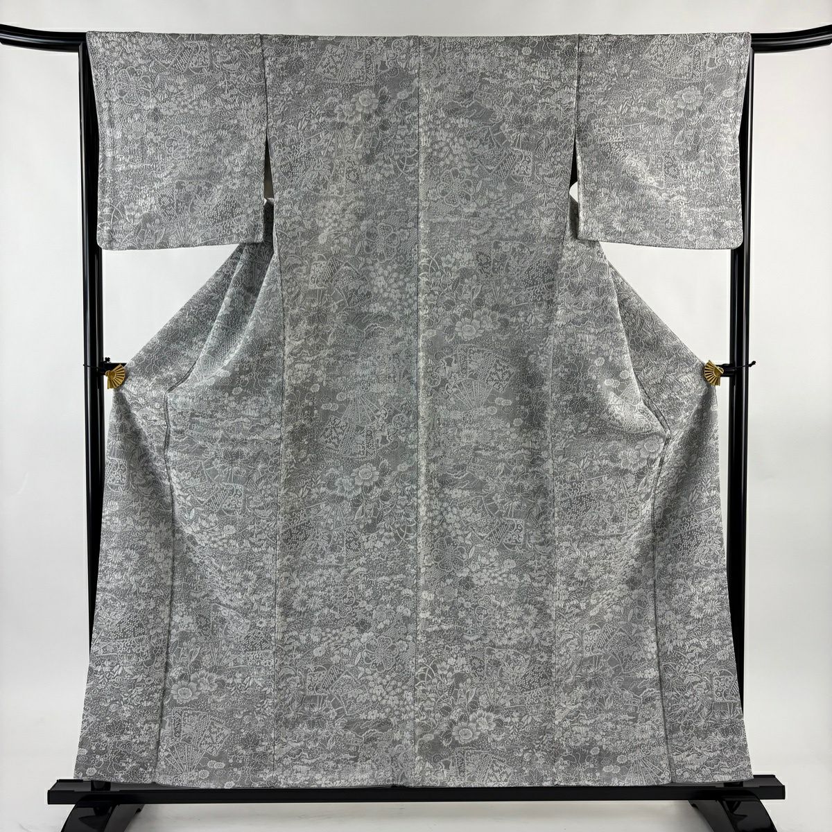 50%OFF 小紋 身丈158cm 裄丈64cm M 袷 鈴乃屋 菊 扇面 金彩 青灰色 正絹 名品 K50