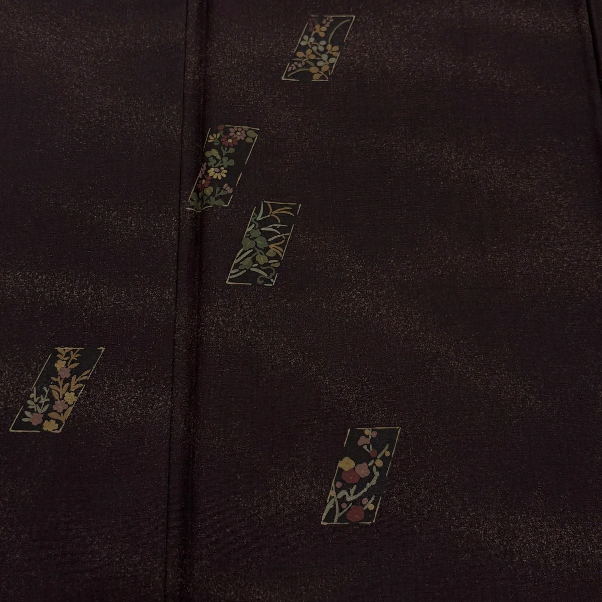 50%OFF 小紋 身丈161.5cm 裄丈66cm M 袷 大島紬地 証紙あり 秋草 梅 ぼかし 茶紫 正絹 名品 K50