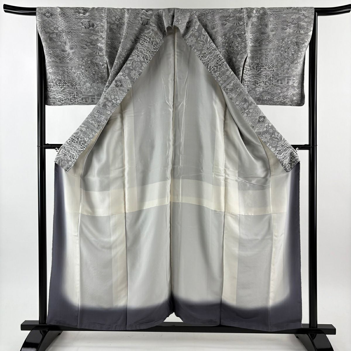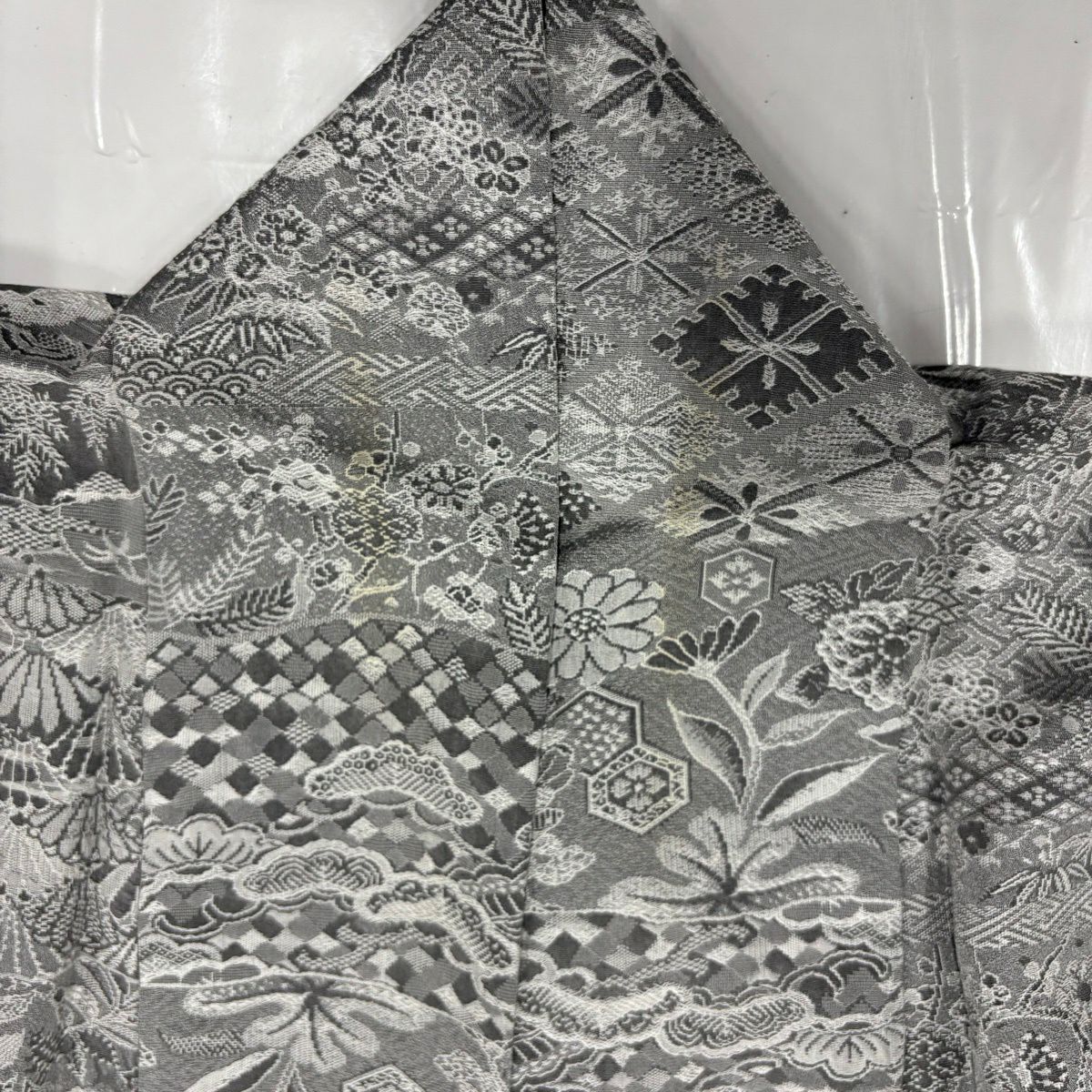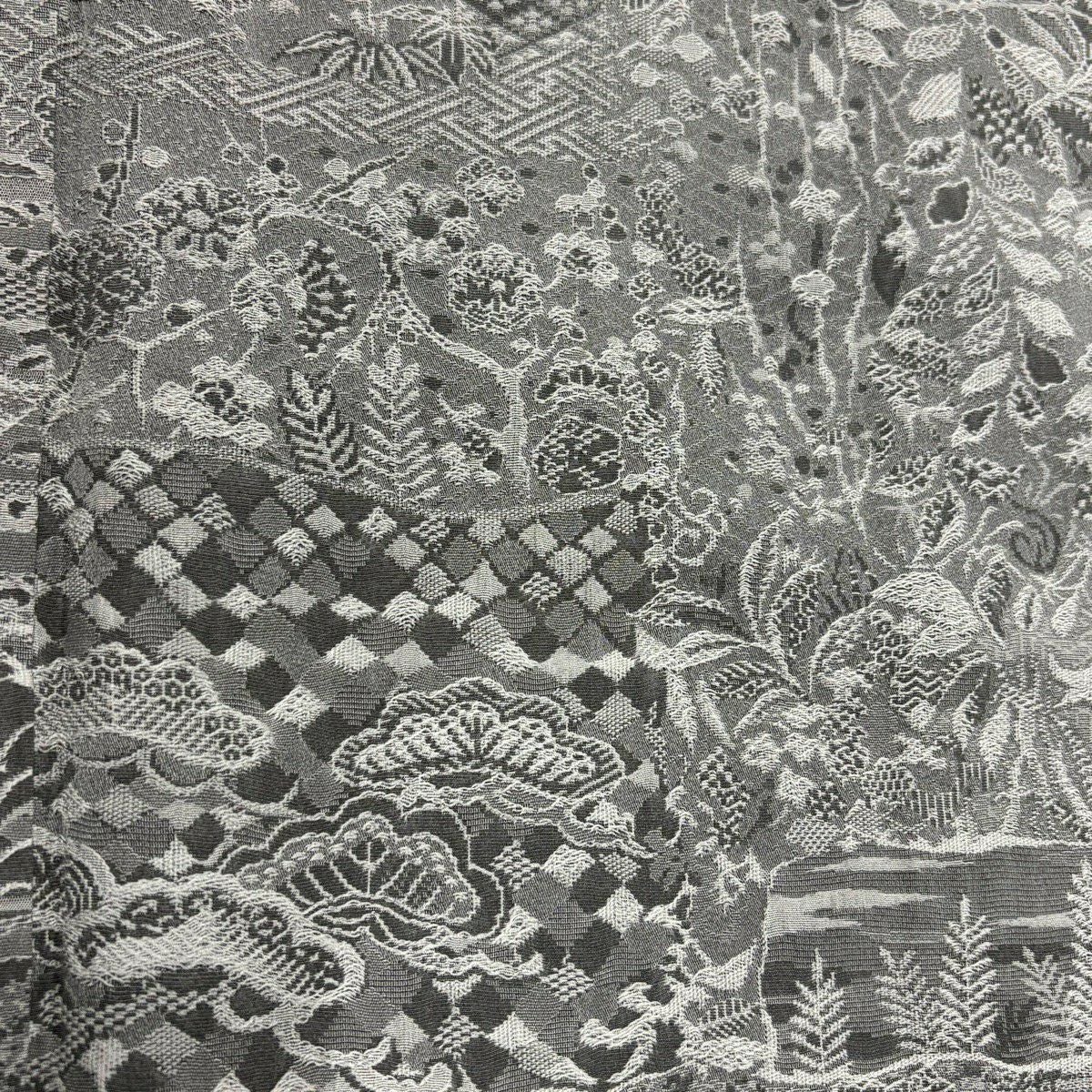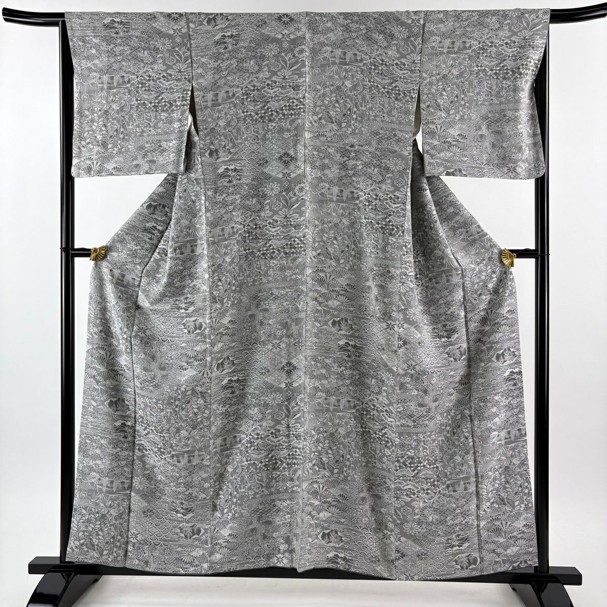 50%OFF 小紋 身丈159cm 裄丈65.5cm M 袷 紋意匠 草花 松 灰色 正絹 名品 K50
