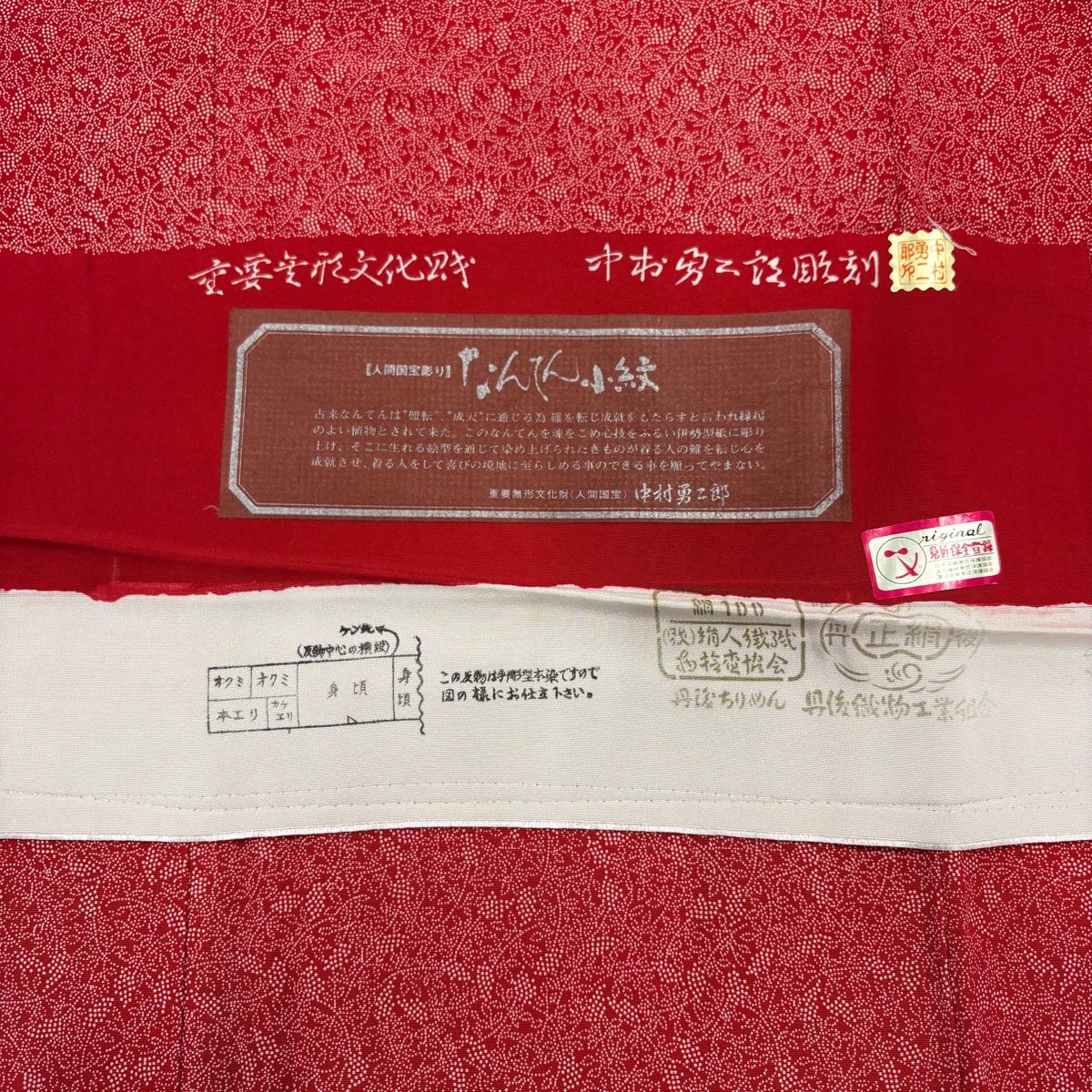 【美品】 江戸小紋 身丈162.5cm 裄丈65cm M 袷 人間国宝 中村勇二郎 落款あり 葉 実 赤 正絹 名品