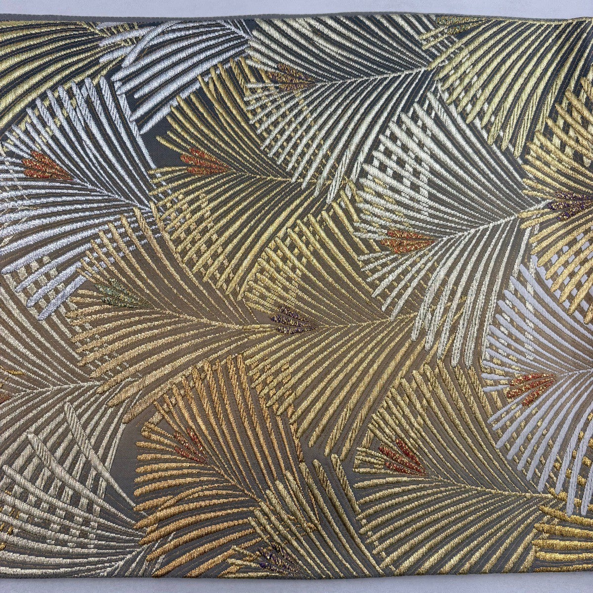 【美品】 袋帯 秀品 草花 波 金糸 灰茶 全通 正絹