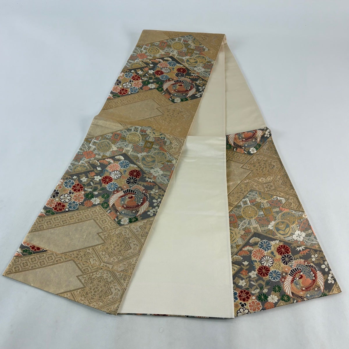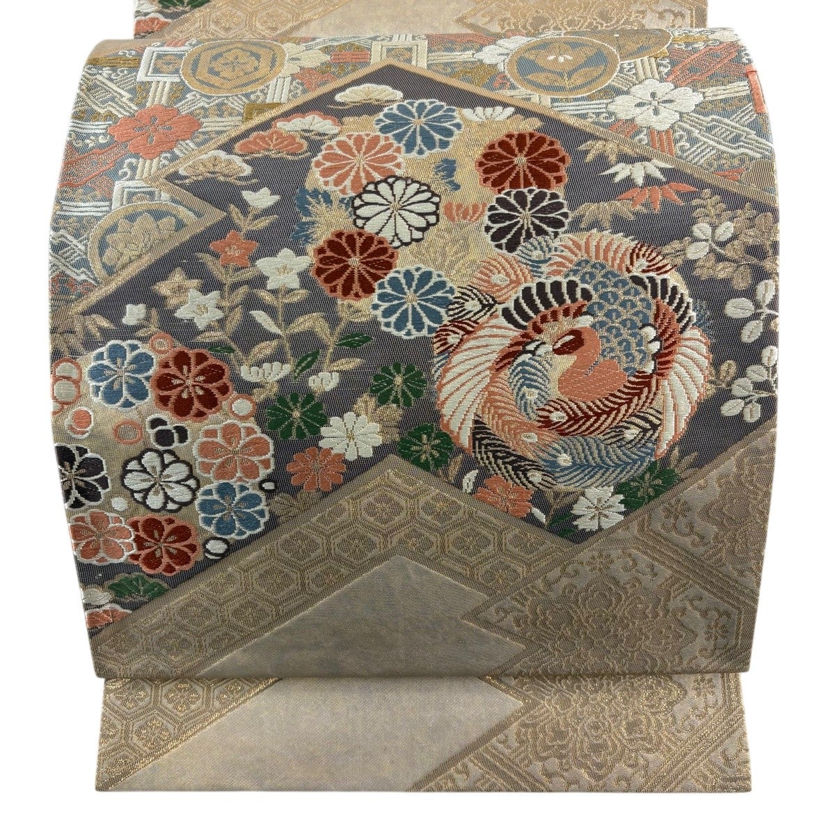 【美品】 袋帯 秀品 鶴 菱 ベージュ 六通 正絹