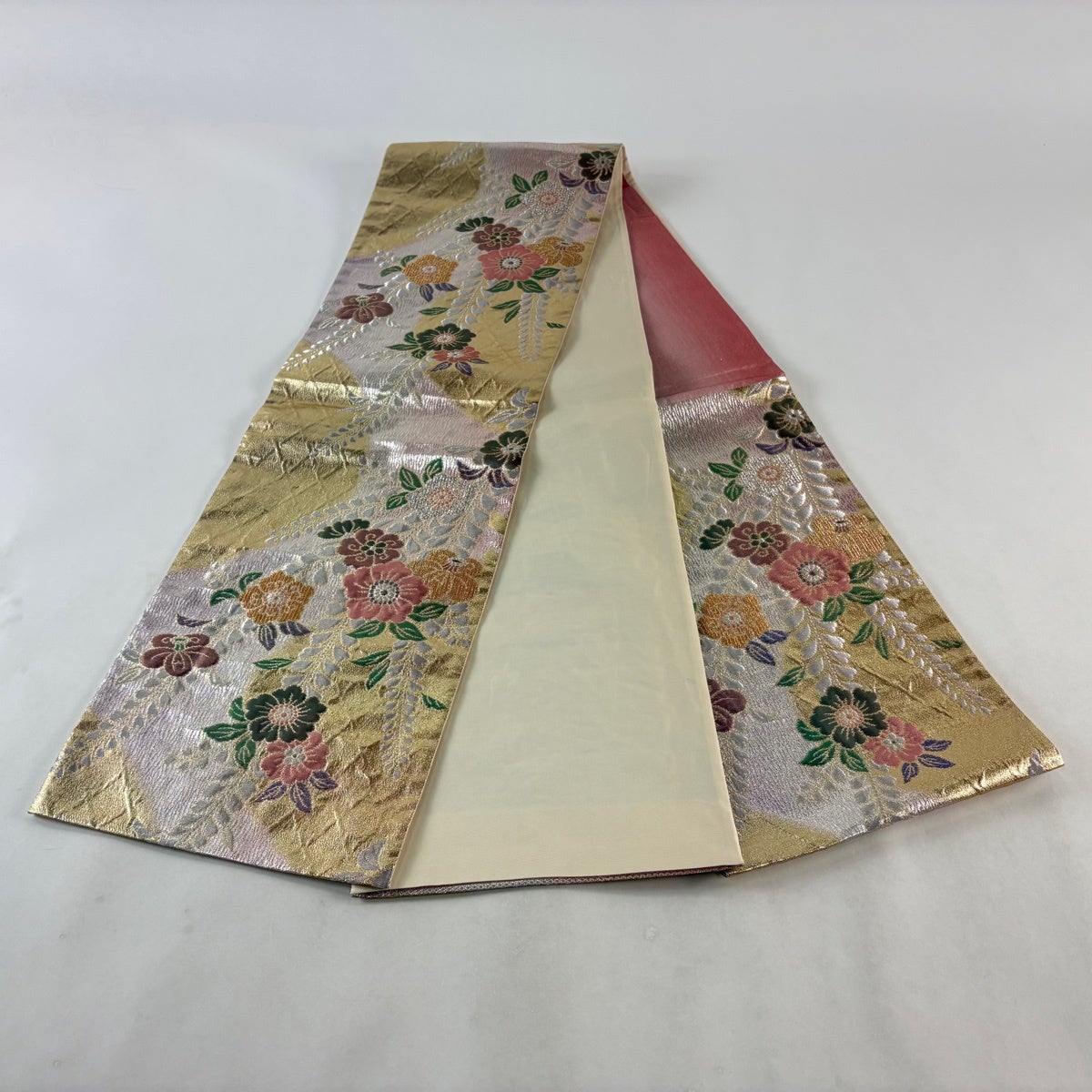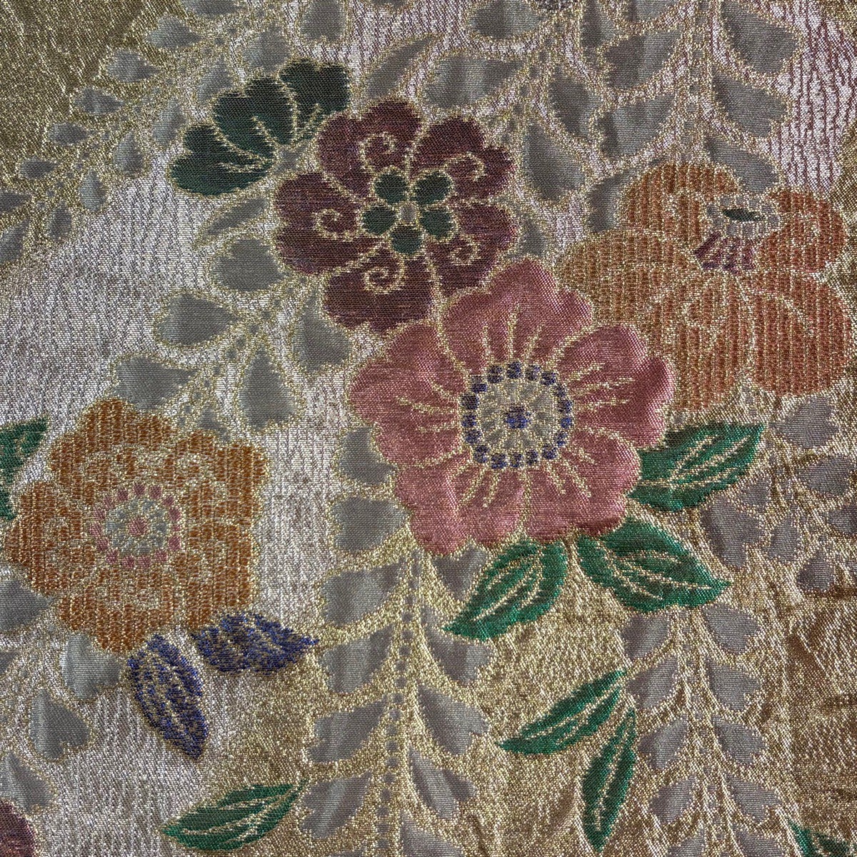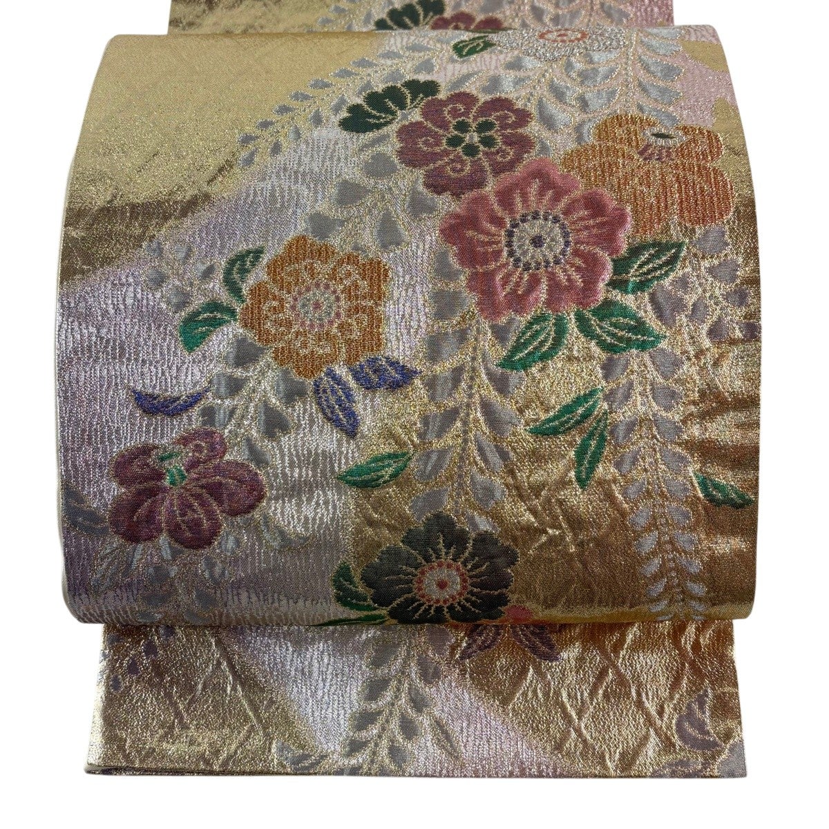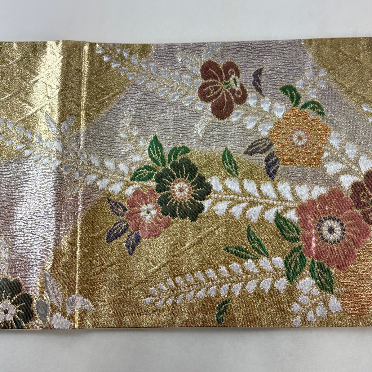 【美品】 袋帯 秀品 反物 花 金糸 茶色 六通 正絹