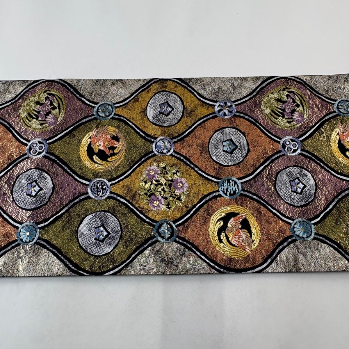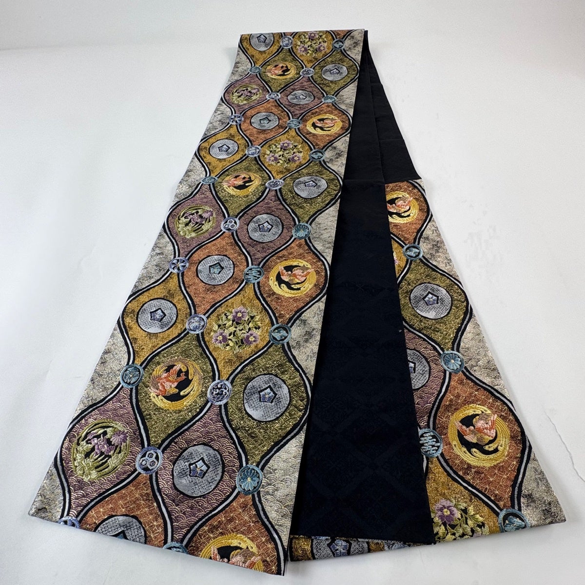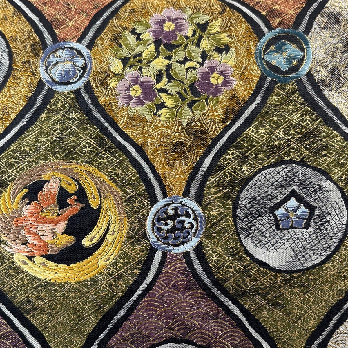 【美品】 袋帯 秀品 花丸文 鳥 箔 金色 六通 正絹
