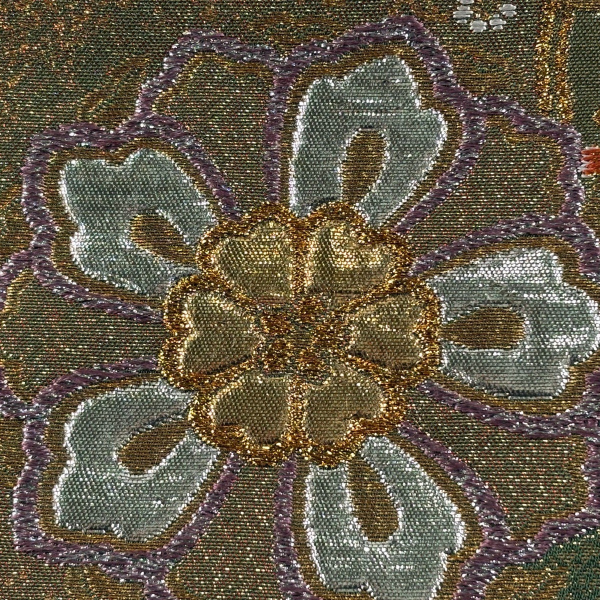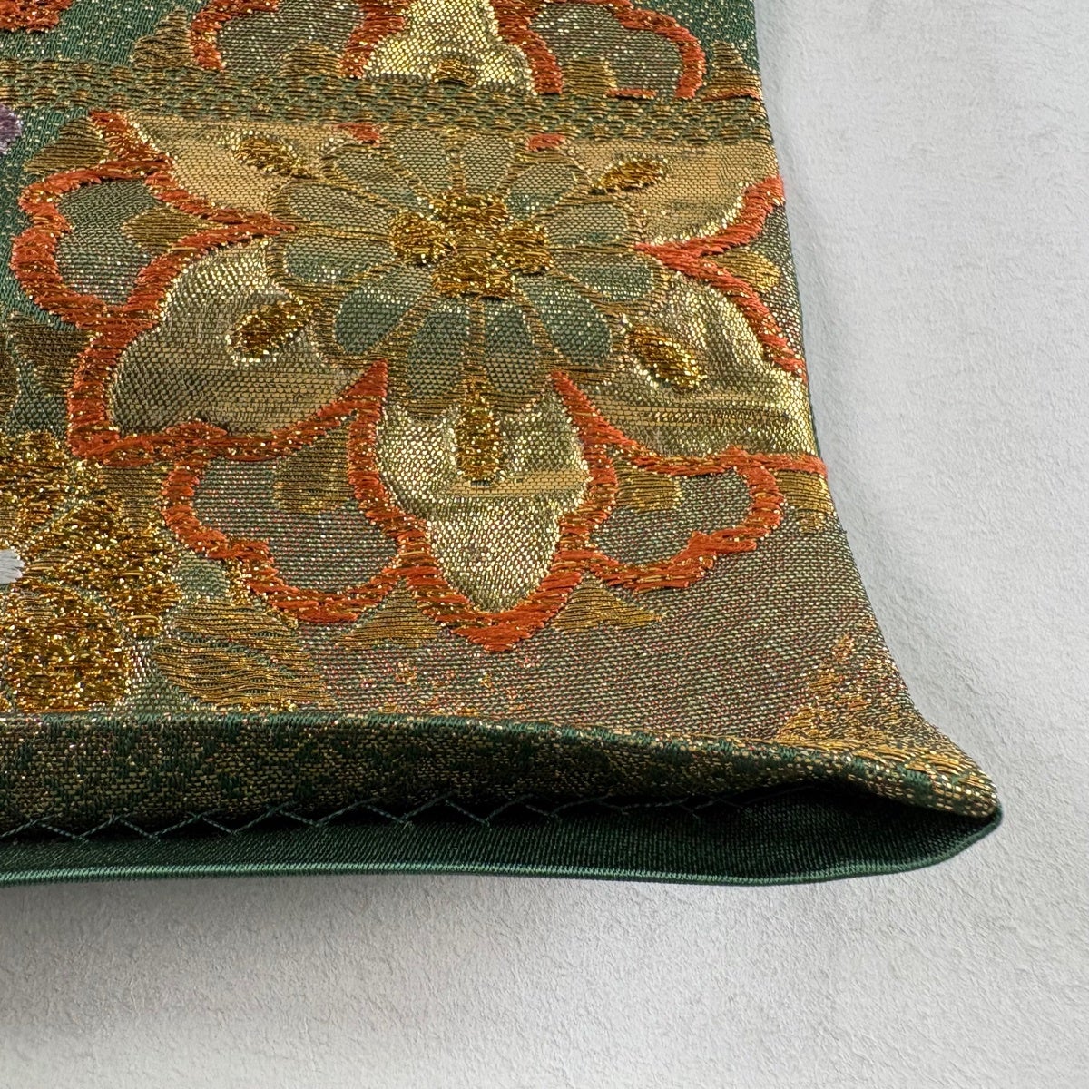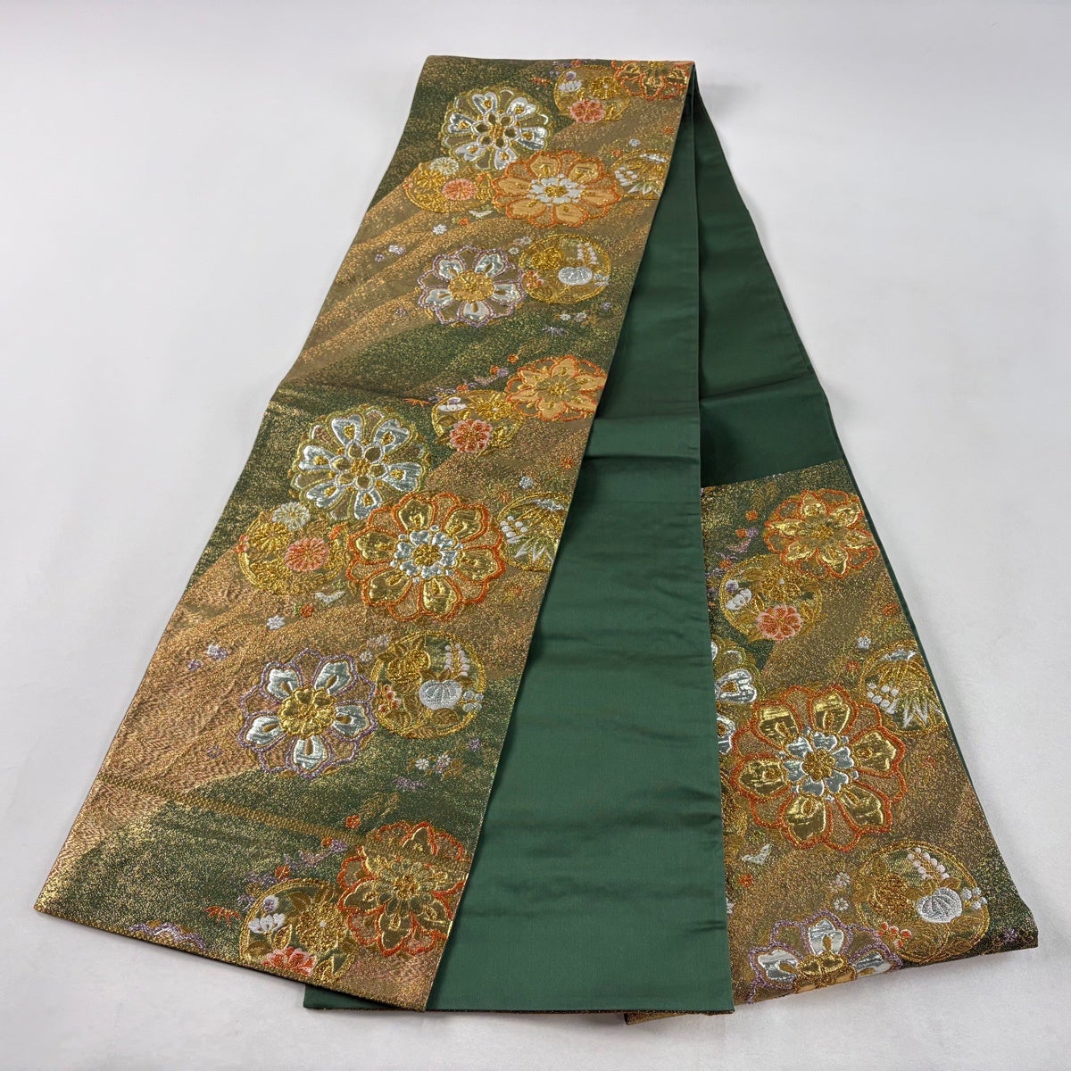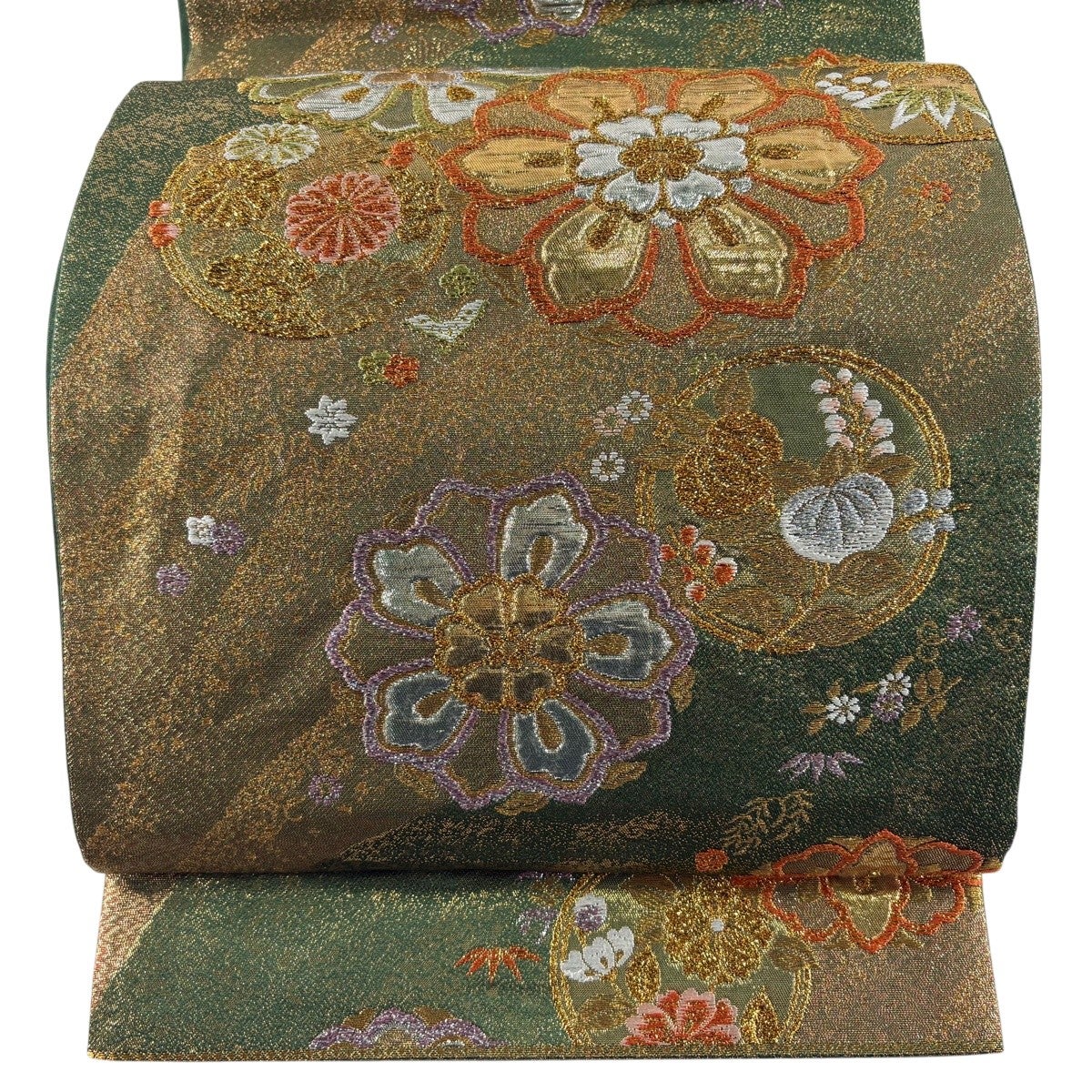 【美品】 袋帯 秀品 華文 草花 金糸 箔 緑 六通 正絹