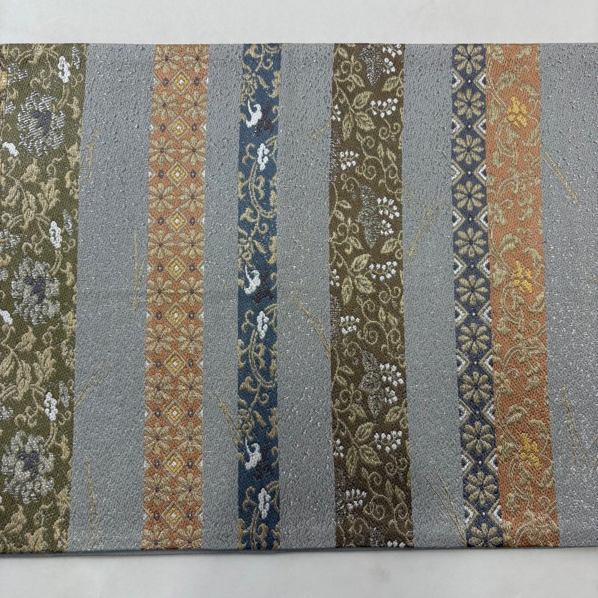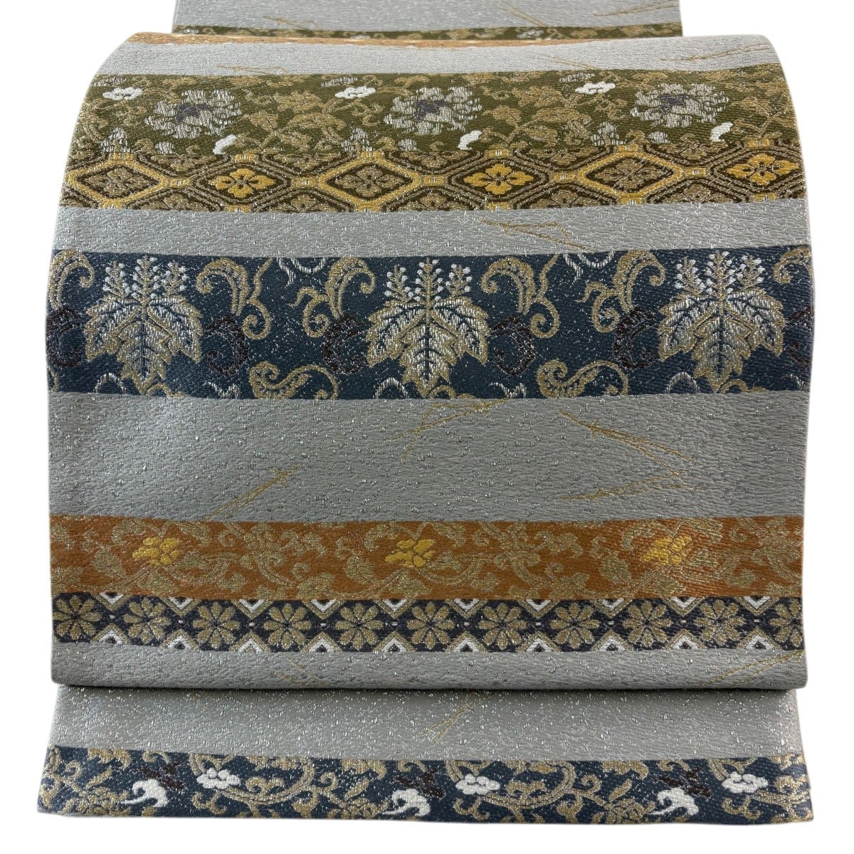 【美品】 袋帯 名品 段縞 草花 輪奈織 金銀糸 灰色 六通 正絹