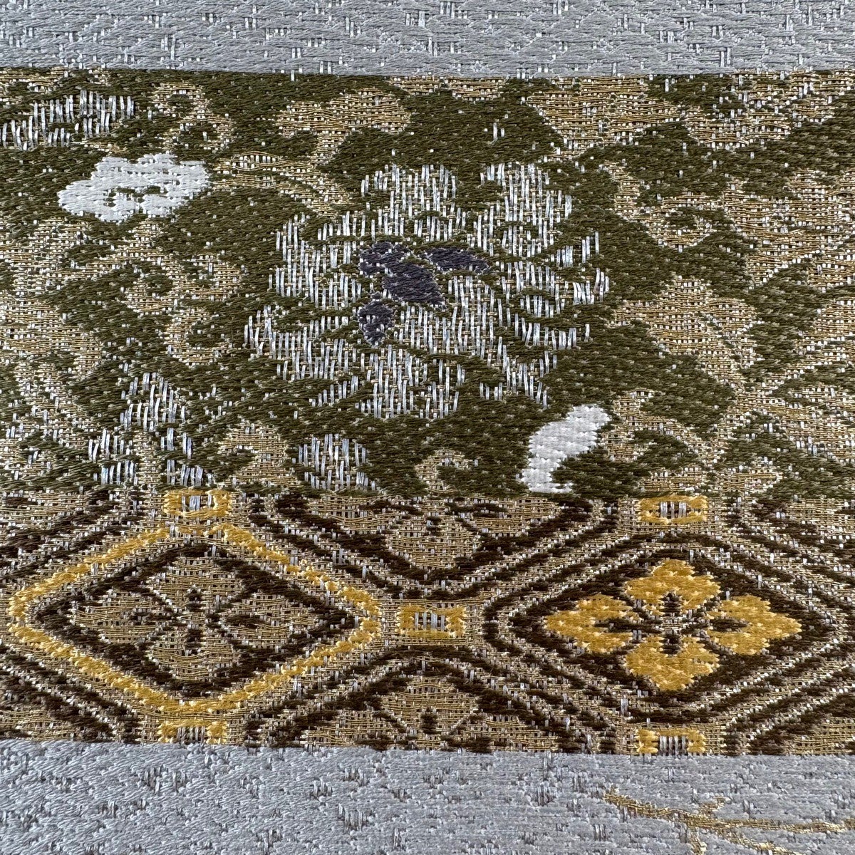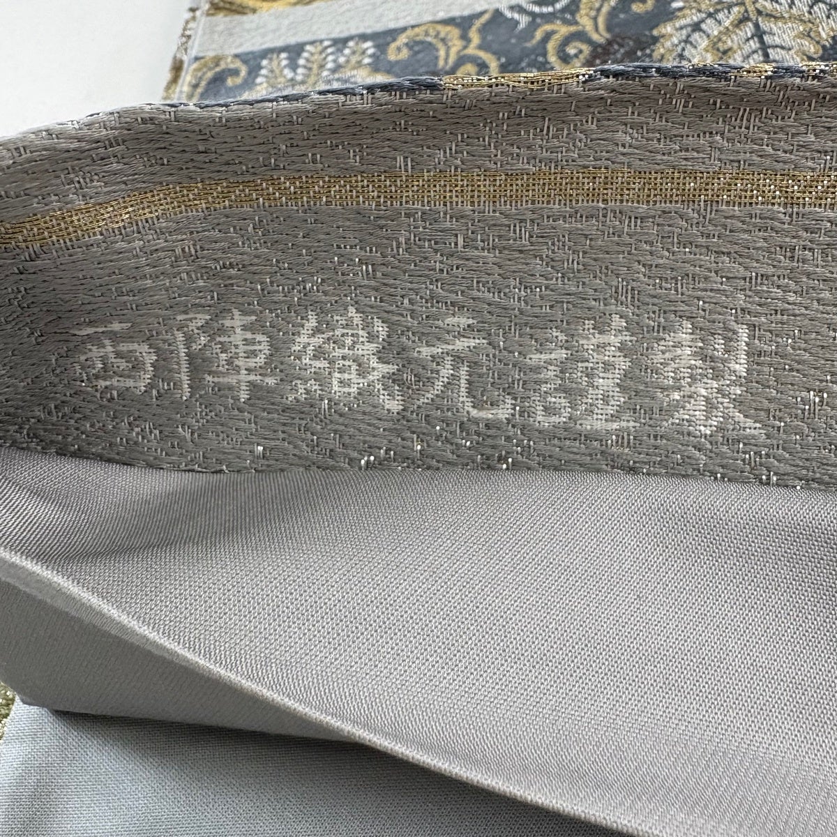 【美品】 袋帯 秀品 古代間道 花唐草 金糸 箔 灰色 六通 正絹