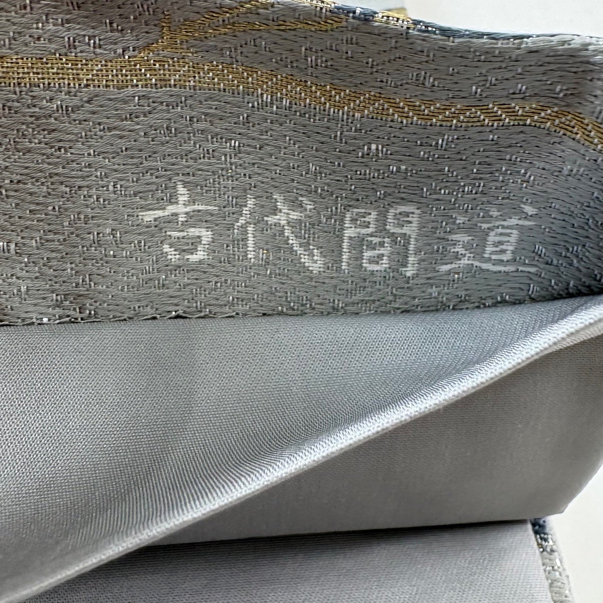 【美品】 袋帯 秀品 関西仕立て 草花 金糸 箔 灰色 六通 正絹