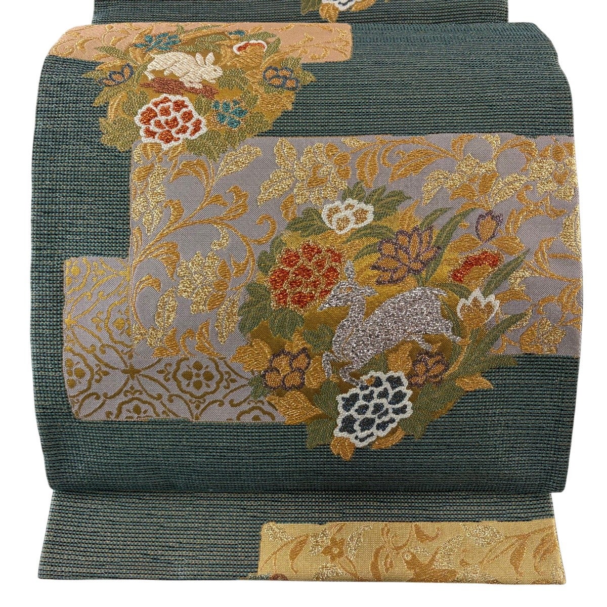 【美品】 袋帯 名品 うさぎ 花唐草 金糸 箔 灰緑 六通 正絹