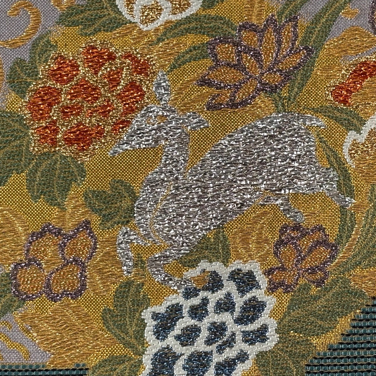 【美品】 袋帯 秀品 うさぎ 花鳥 金糸 箔 金色 六通 正絹