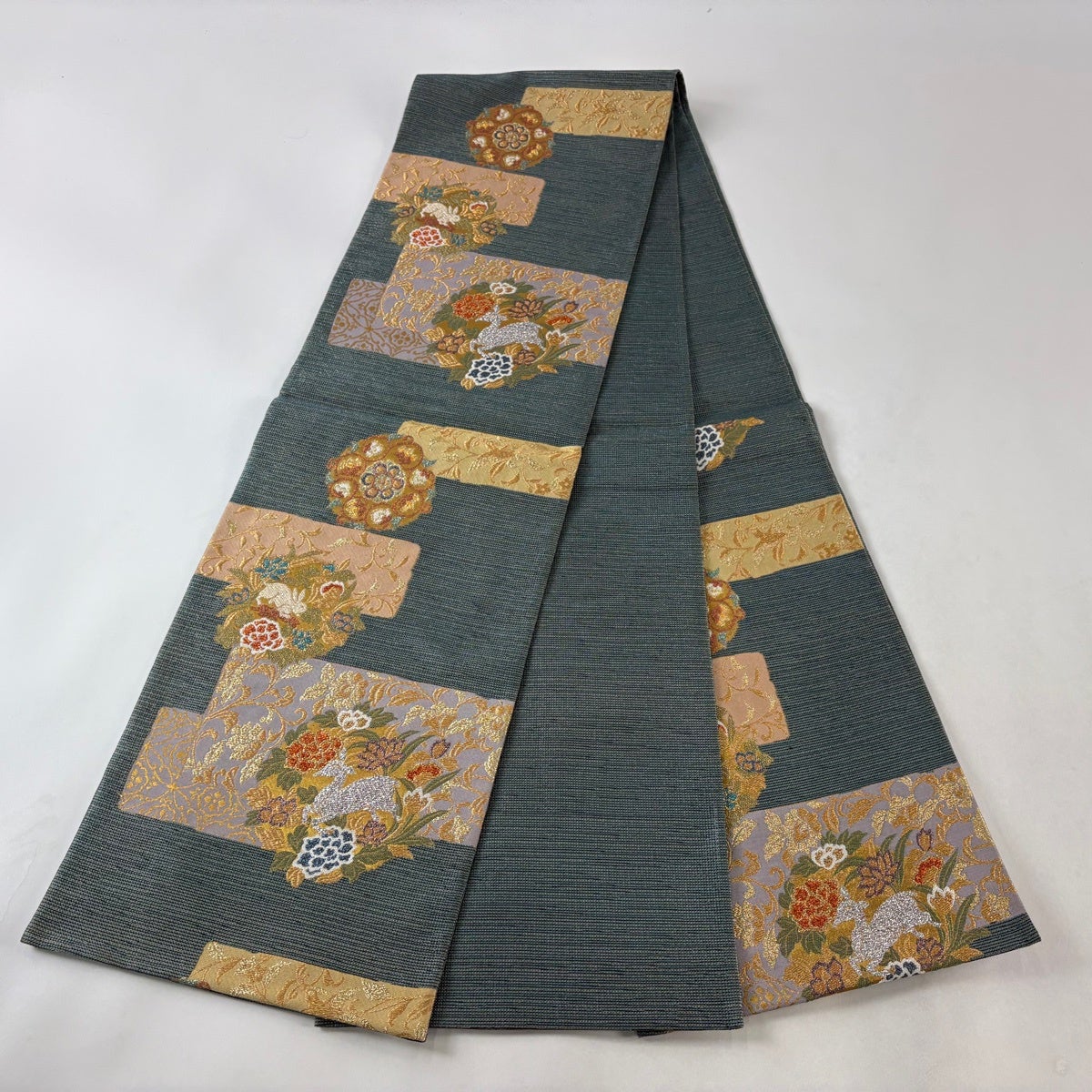 袋帯 逸品 うさぎ 草花 金銀糸 刺繍 青灰色 お太鼓柄 正絹