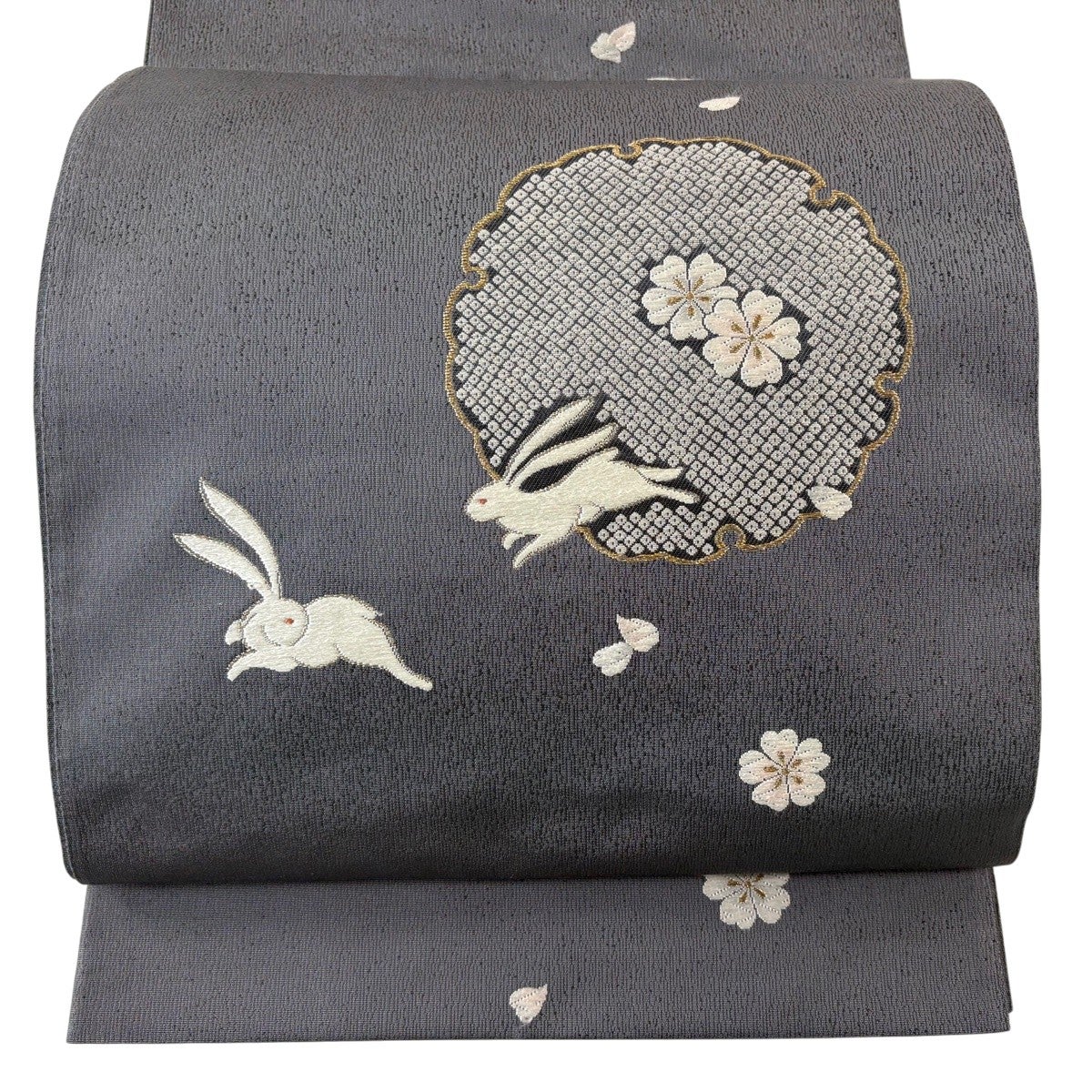 袋帯 秀品 桜 うさぎ 金糸 刺繍 灰色 お太鼓柄 正絹