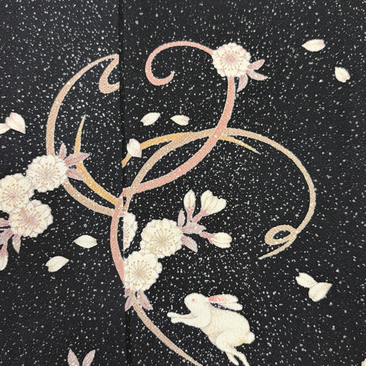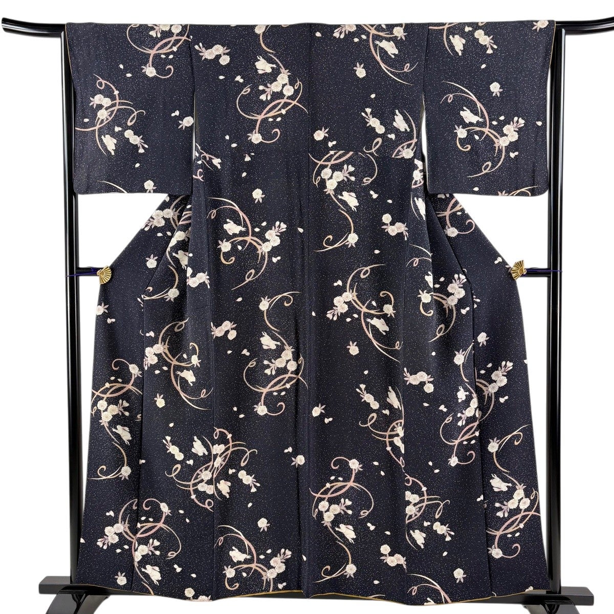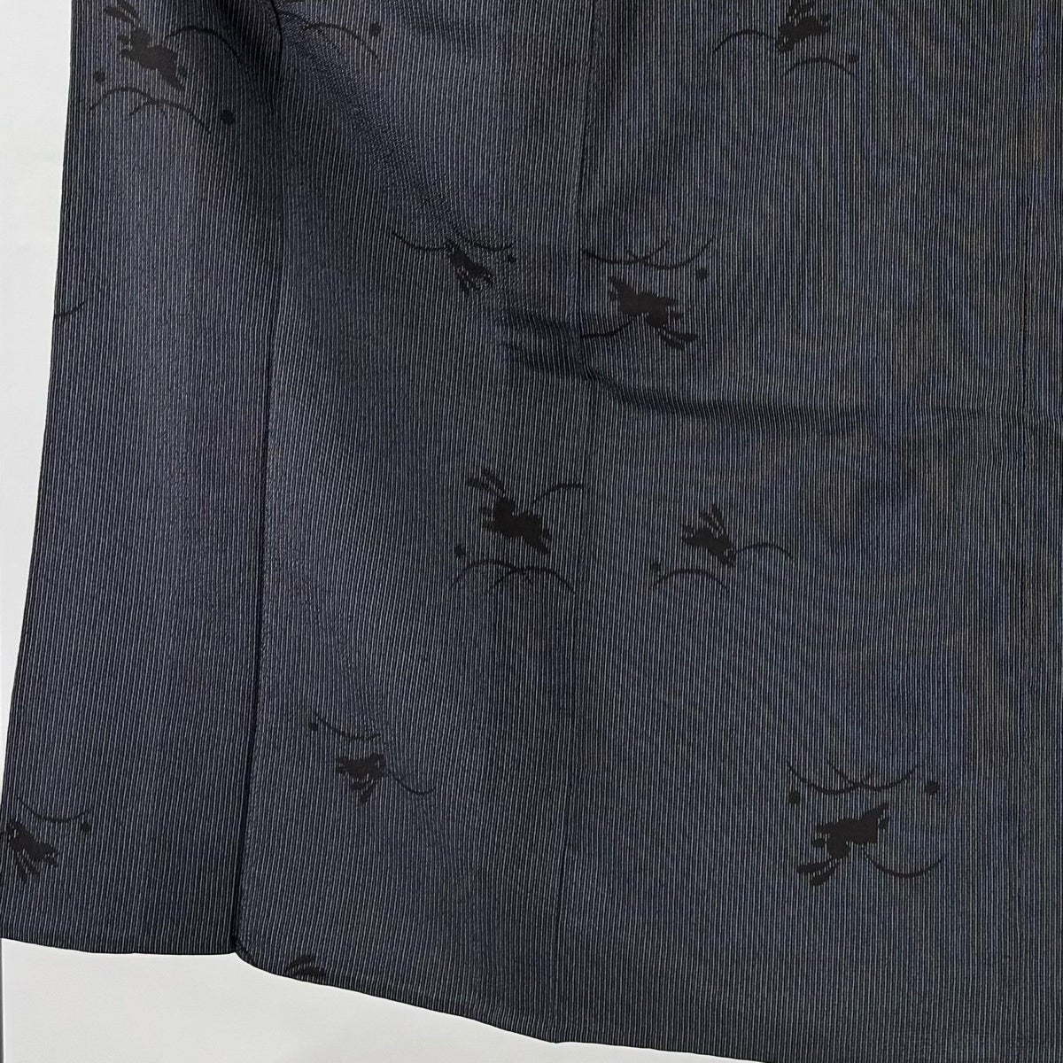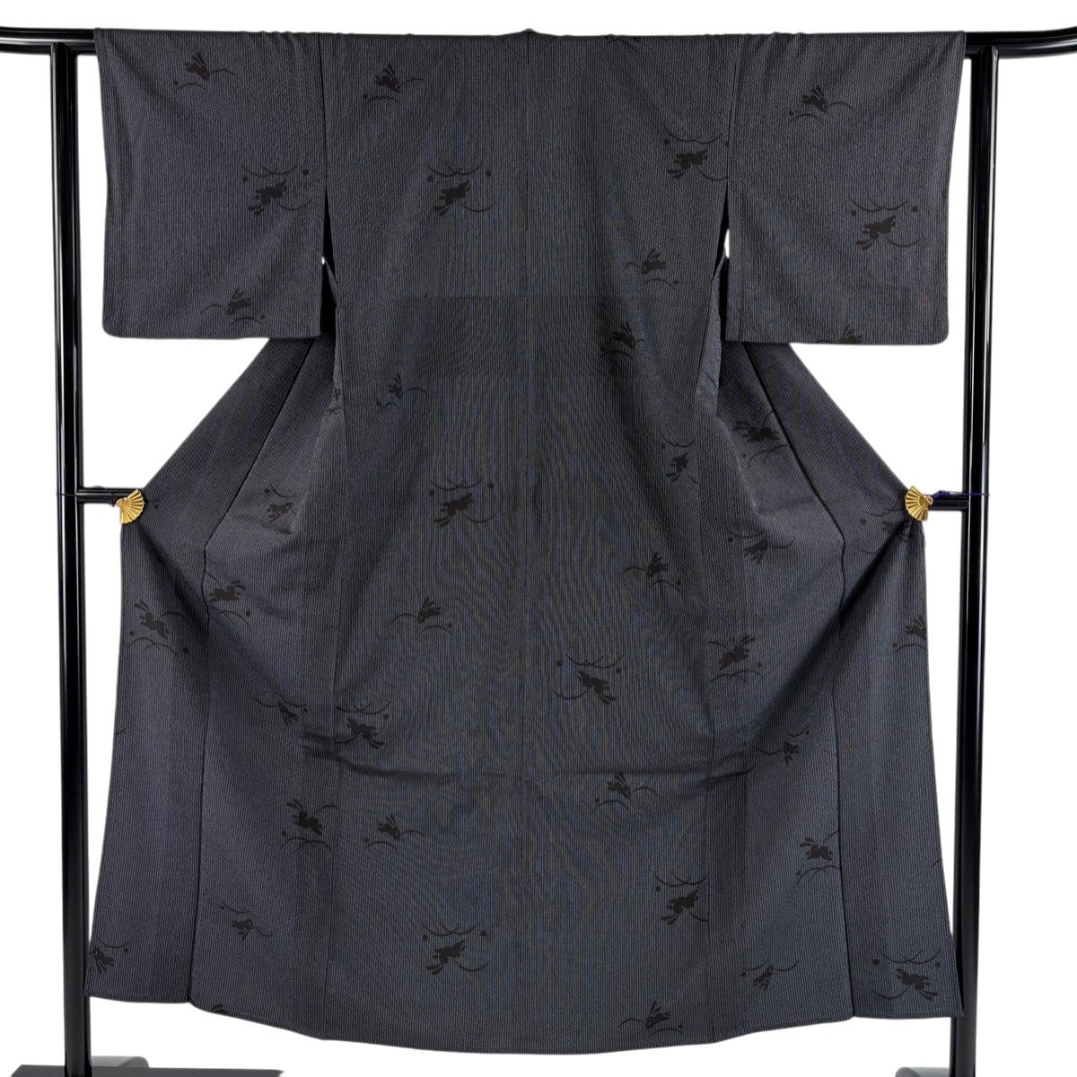 【美品】 小紋 身丈164cm 裄丈65cm M 袷 洗える着物 雪輪 うさぎ 墨色 化繊 優品