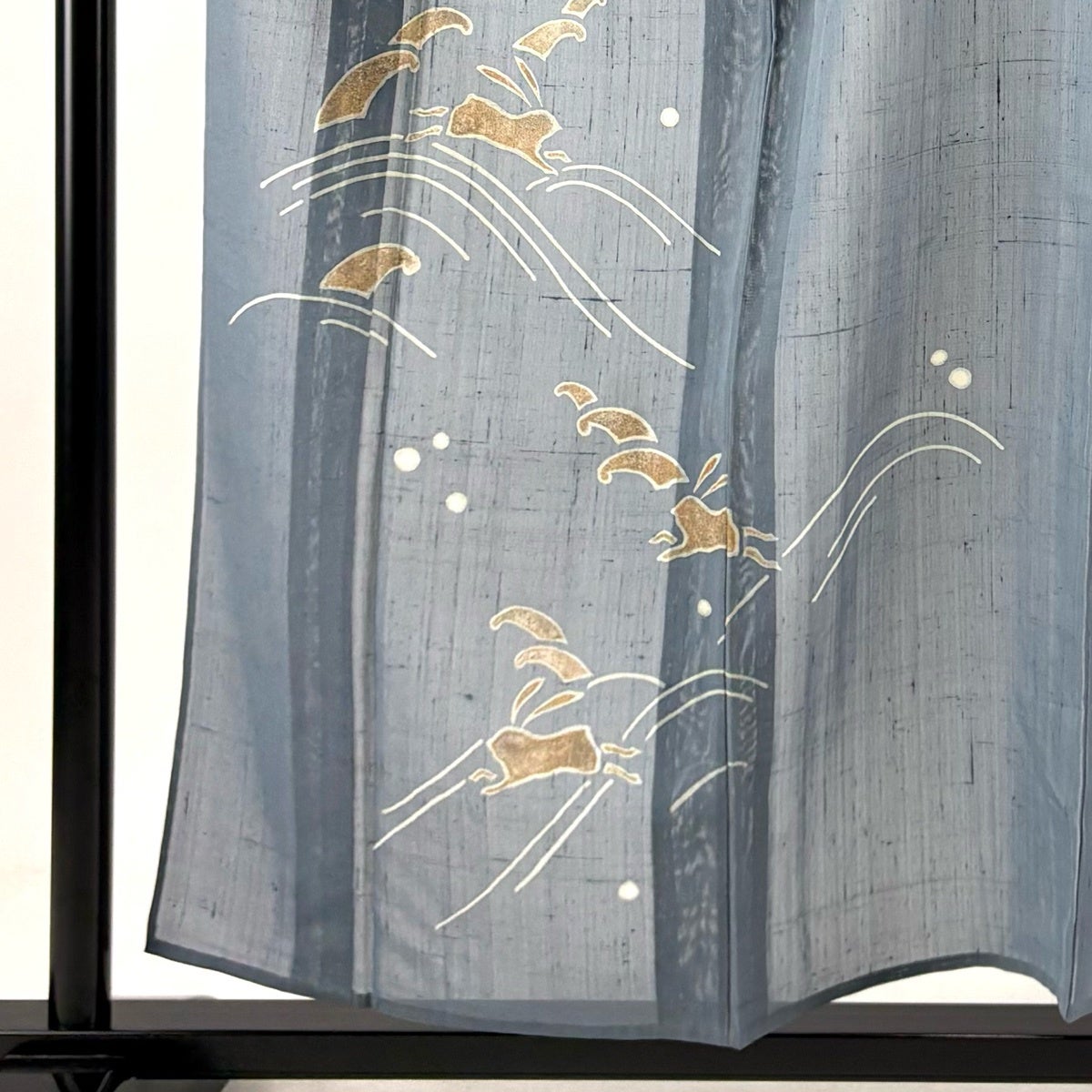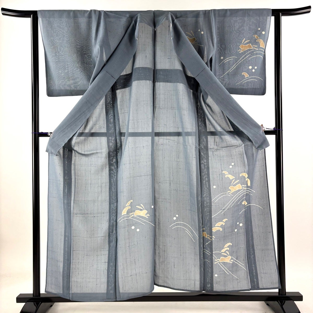 付下げ 身丈156cm 裄丈62cm S 薄物 夏紬地 うさぎ 波 金彩 青灰色 正絹 秀品