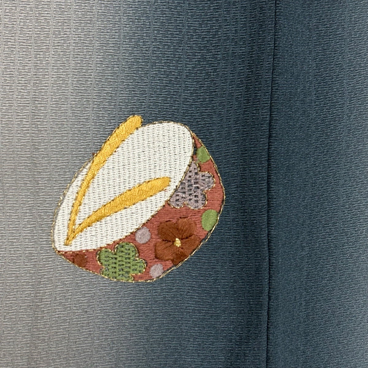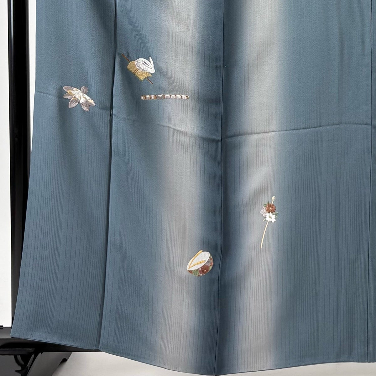 付下げ 身丈162cm 裄丈63cm S 袷 笛 うさぎ 刺繍 金糸 青灰色 正絹 秀品