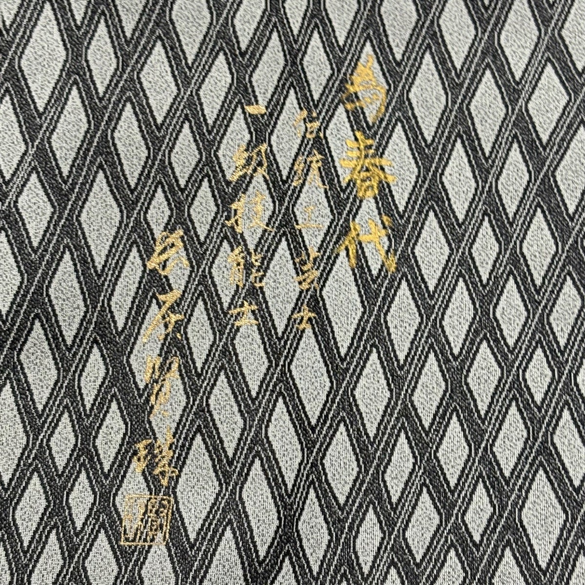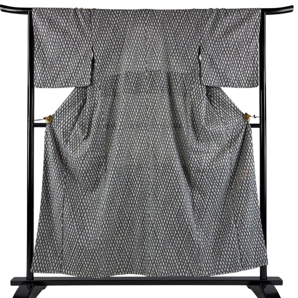 【美品】 お召 身丈154.5cm 裄丈65cm M 袷 背抜き仕立て 落款あり 幾何学模様 灰色 正絹 逸品
