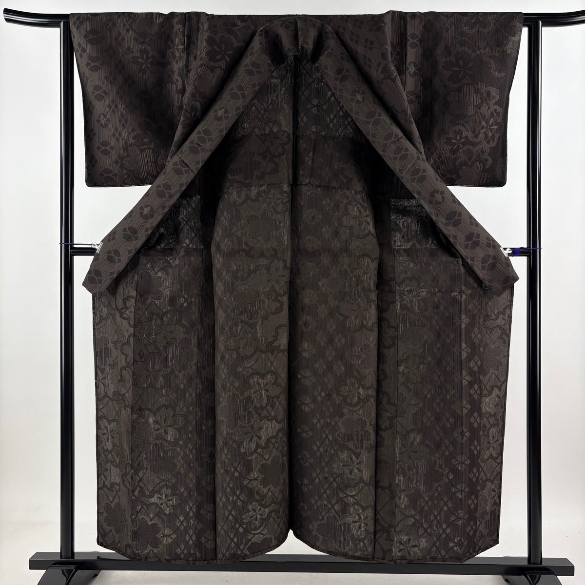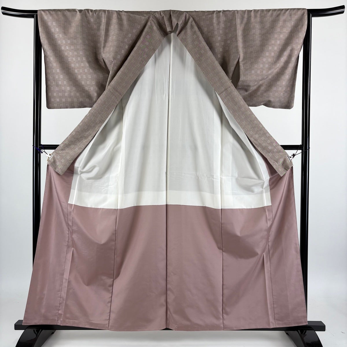 30%OFF お召 身丈157.5cm 裄丈62cm S 単衣 バチ衿 幾何学 灰茶 正絹 名品 K30