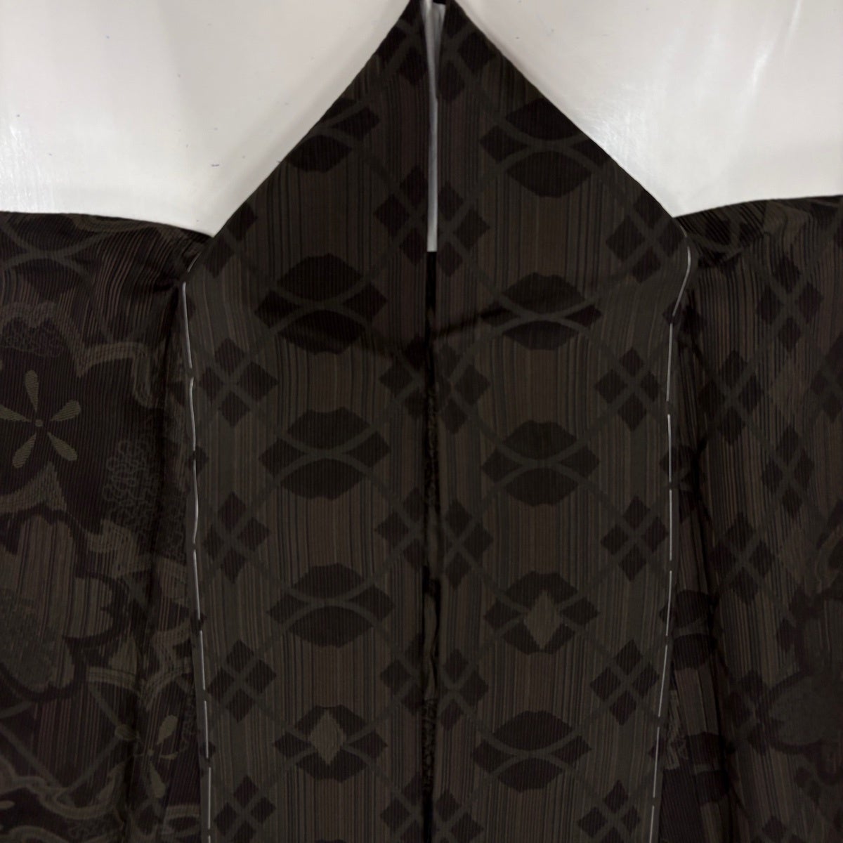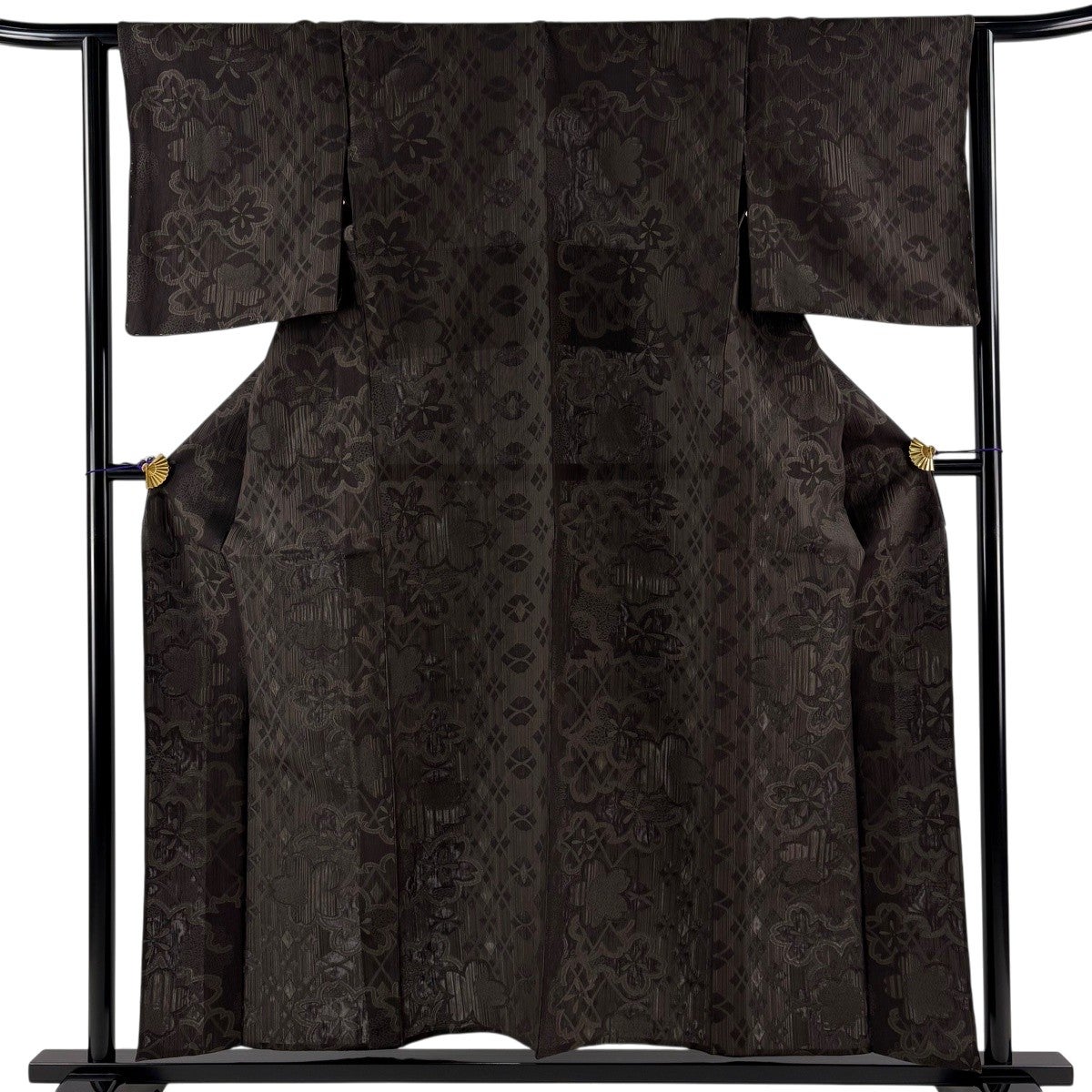 20%OFF お召 身丈160cm 裄丈66cm M 袷 背抜き 有職文様 七宝 焦茶色 正絹 逸品 K30