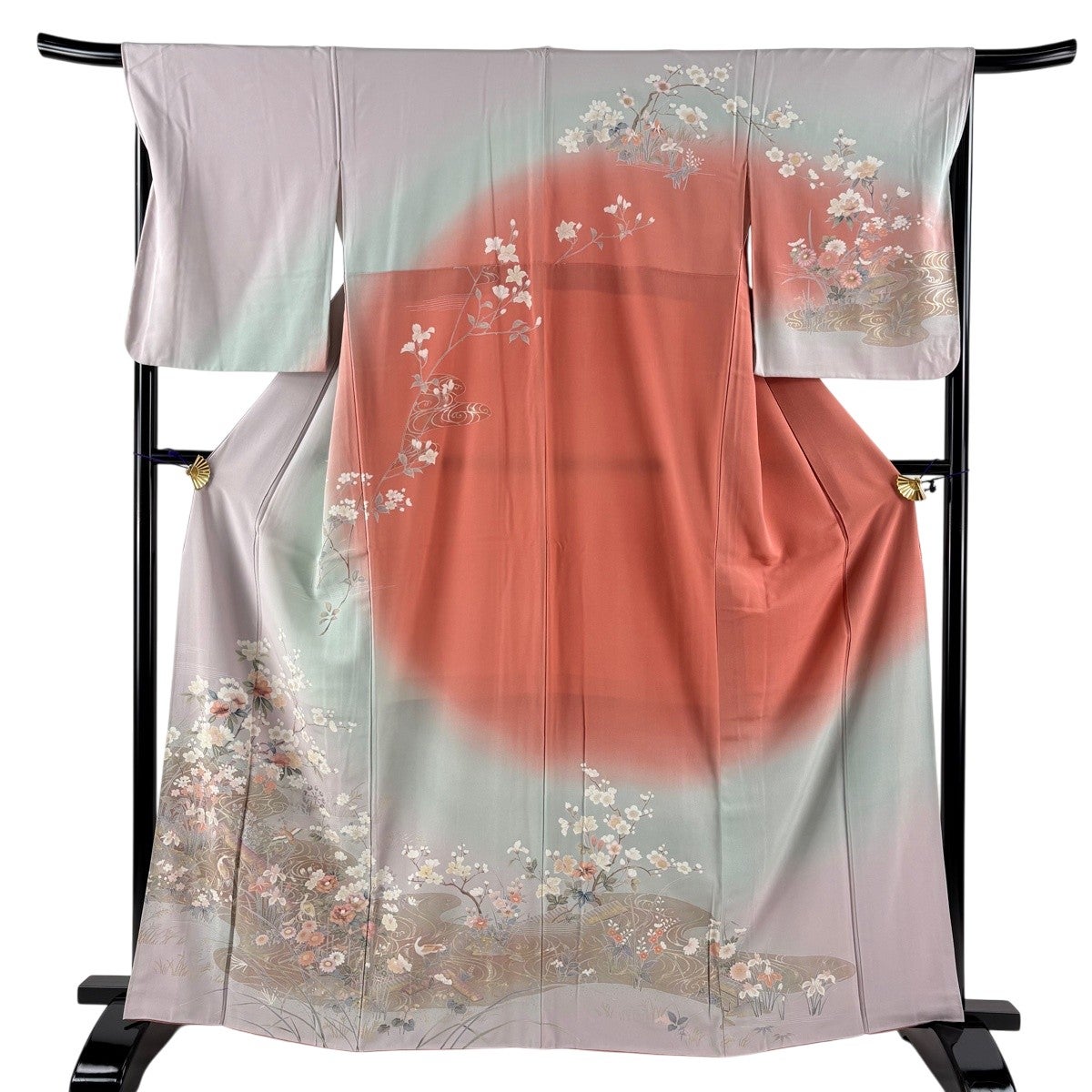 訪問着 身丈167cm 裄丈67cm M 袷 草花 ヱ霞 金彩 絞り サーモンピンク 正絹 秀品