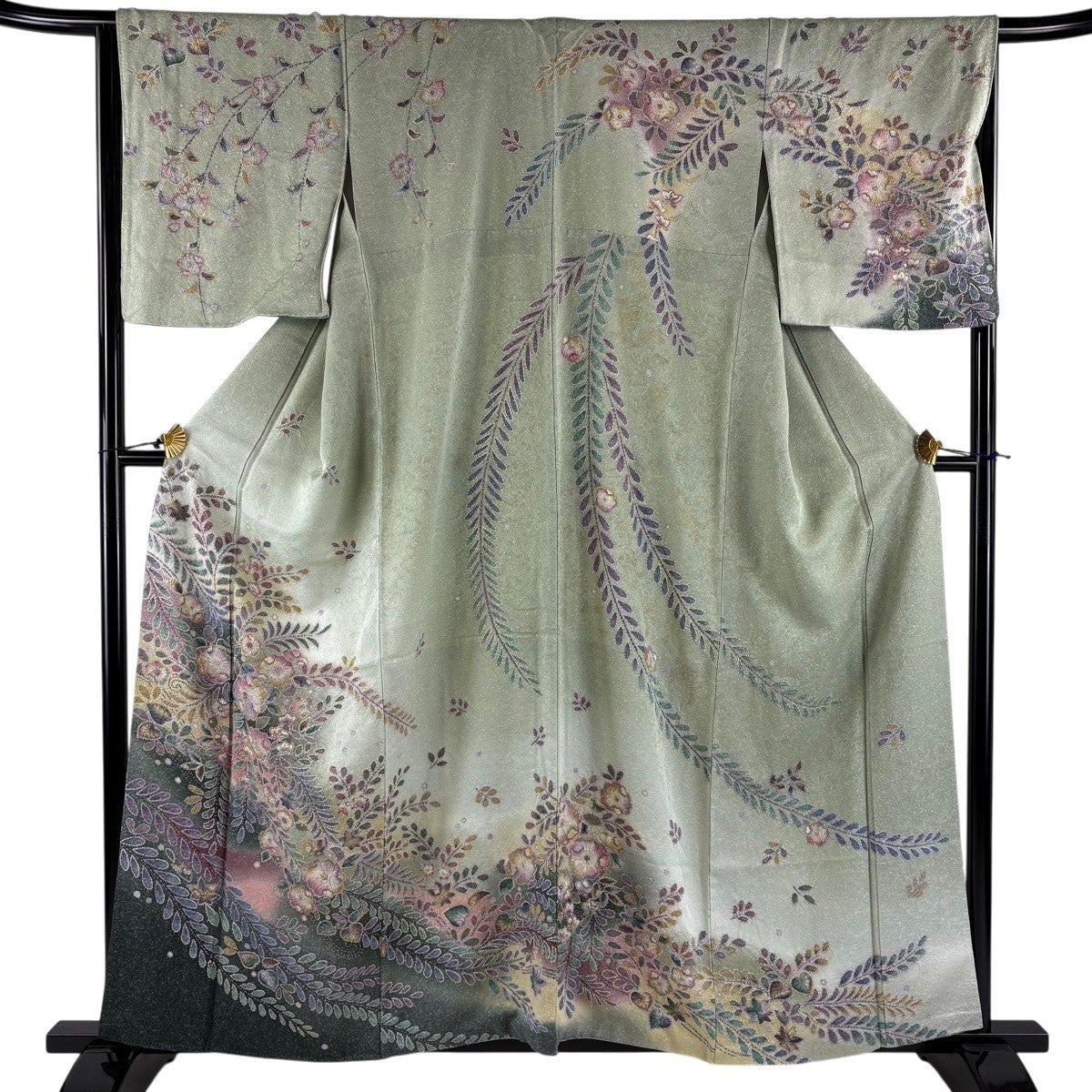付下げ 身丈163cm 裄丈64cm M 単衣 落款あり 枝花 灰緑 正絹 秀品