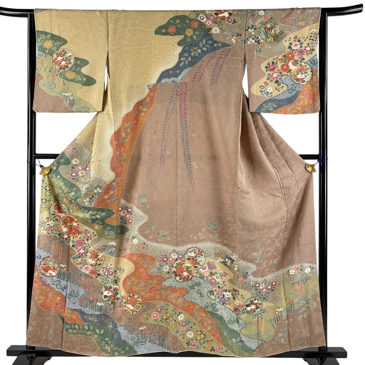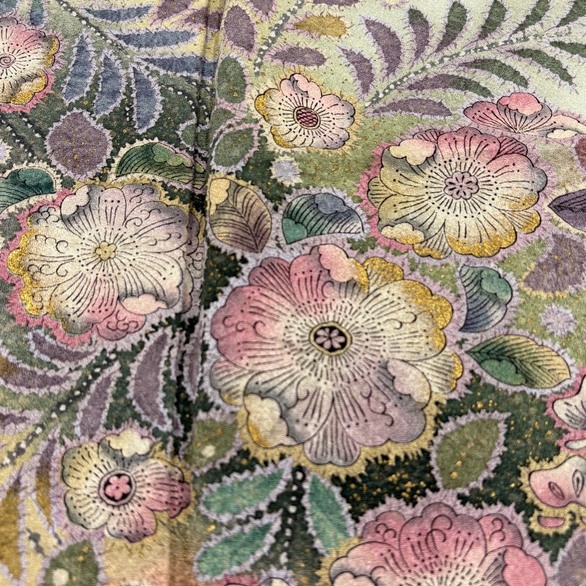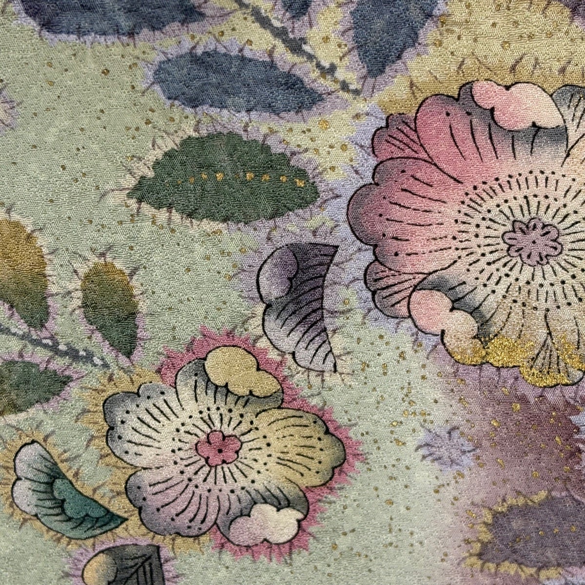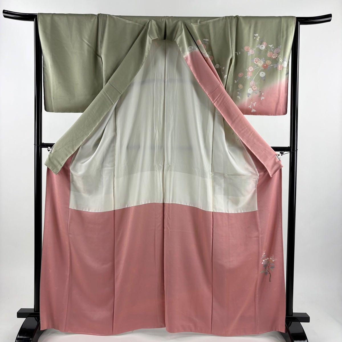 付下げ 身丈160cm 裄丈64cm M 袷 ますいわ屋 菊 萩 刺繍 金糸 茶緑色 正絹 秀品