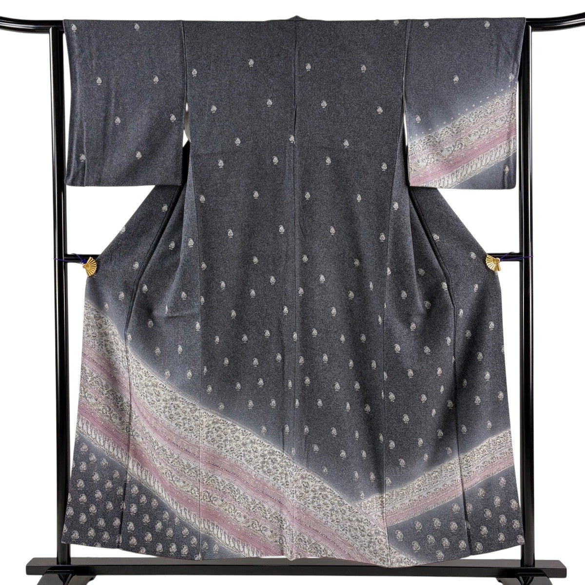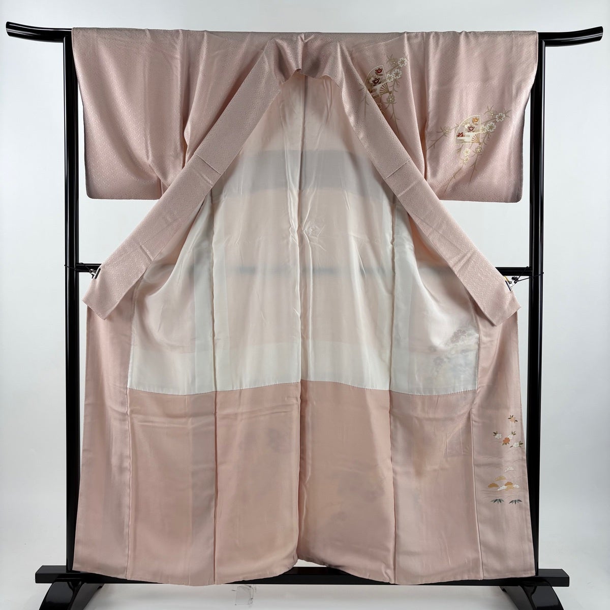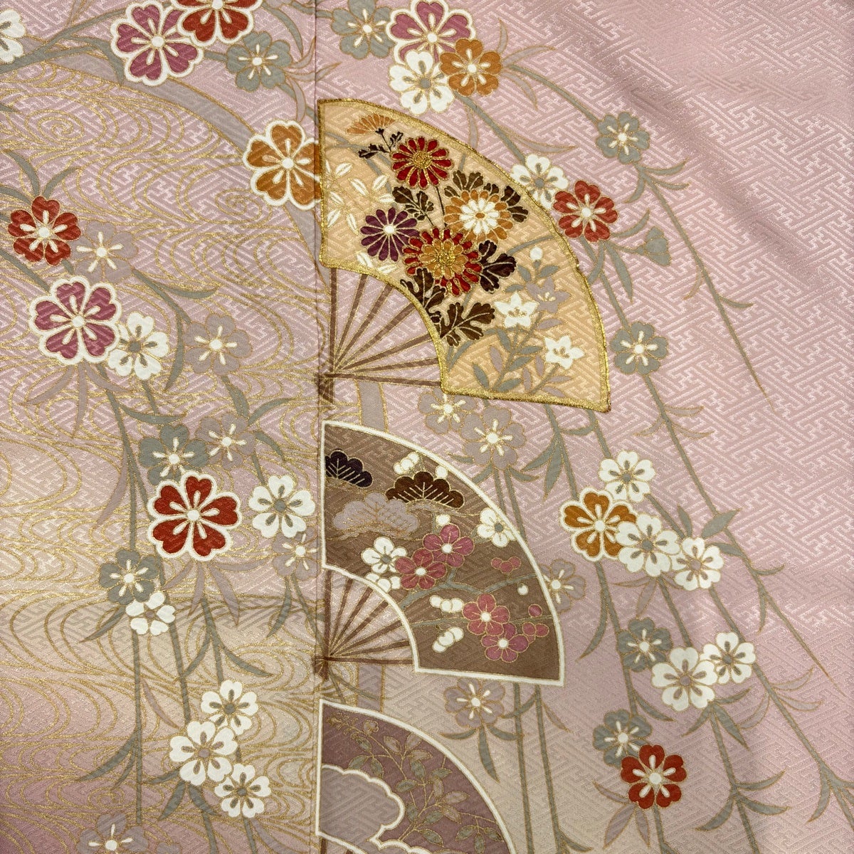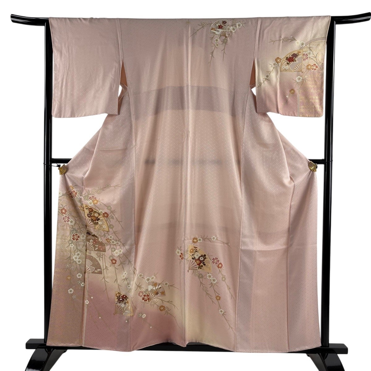 訪問着 身丈157.5cm 裄丈64cm M 袷 扇 桜 金糸 金彩 ピンク 正絹 秀品 一つ紋