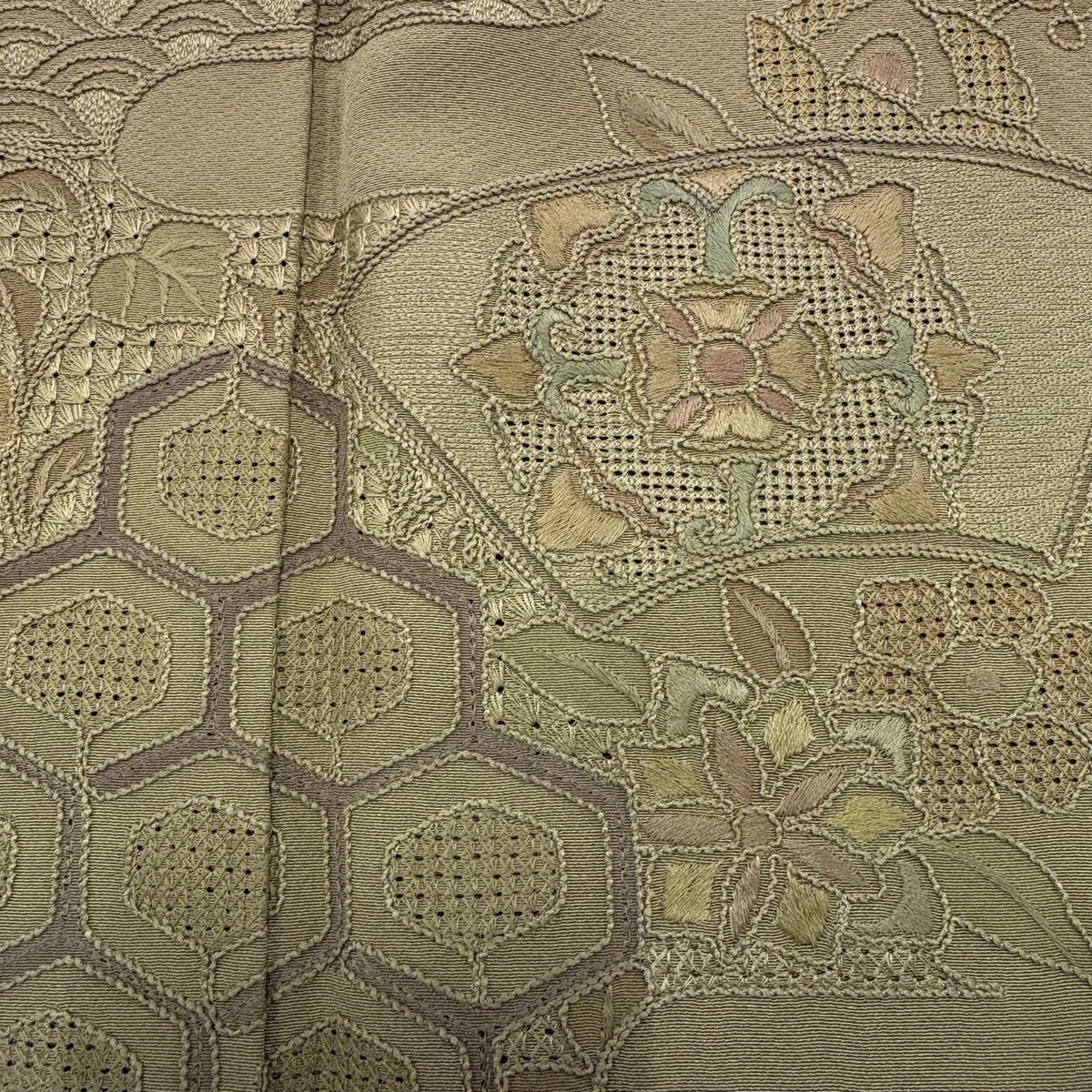 【美品】 付下げ 身丈159cm 裄丈62cm S 袷 亀甲 草花 刺繍 金糸 クリーム 正絹 秀品