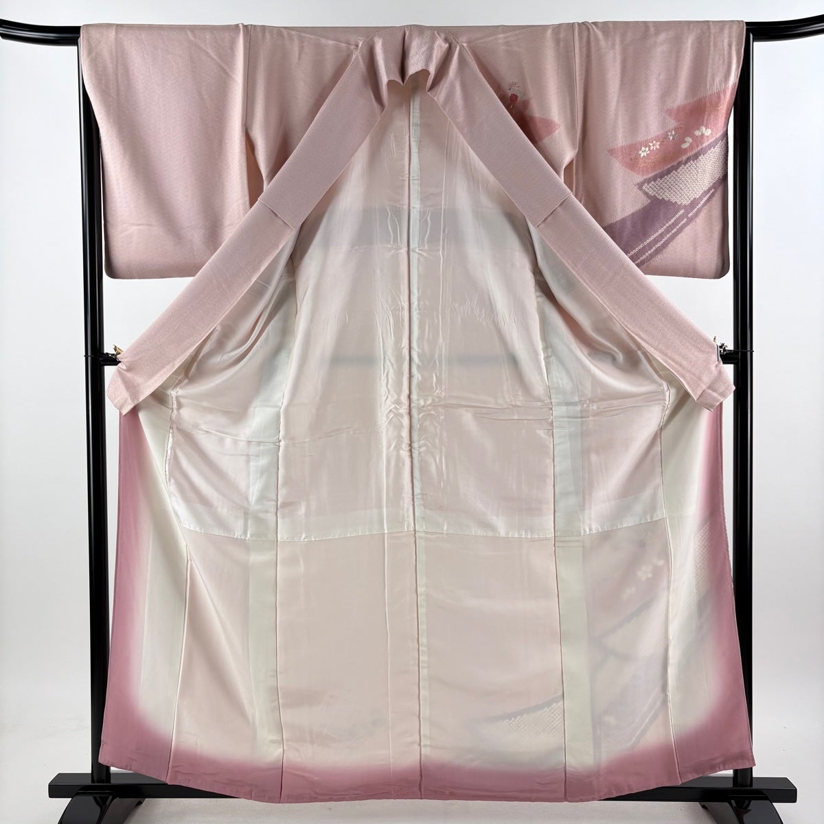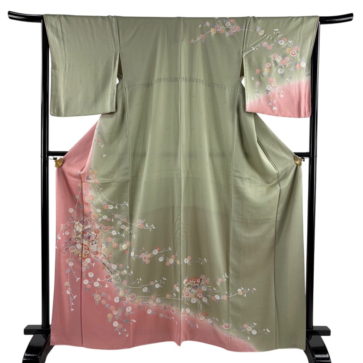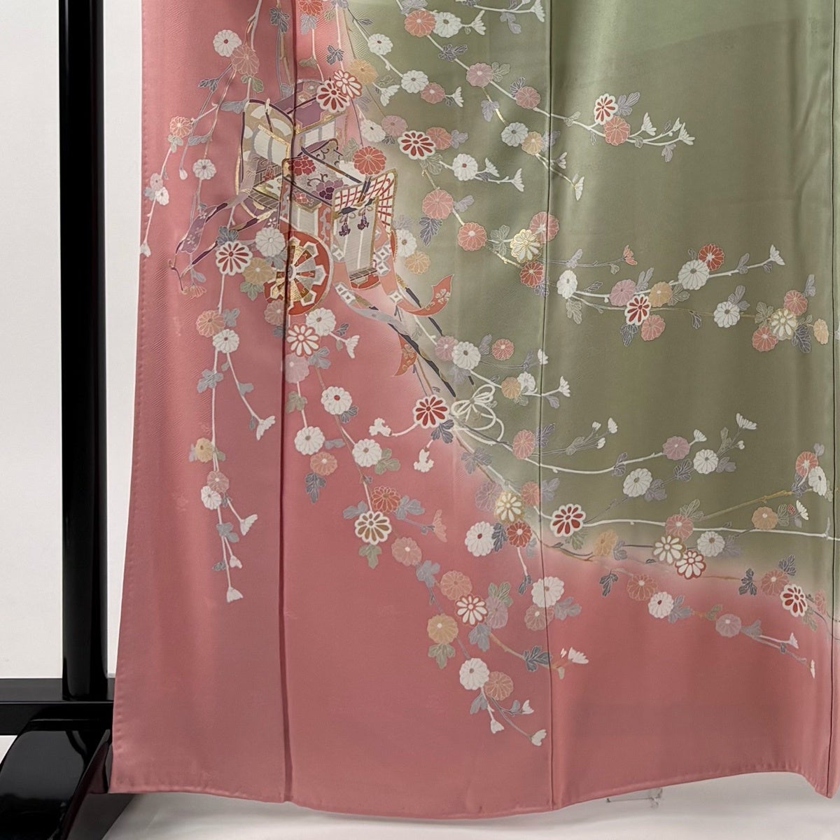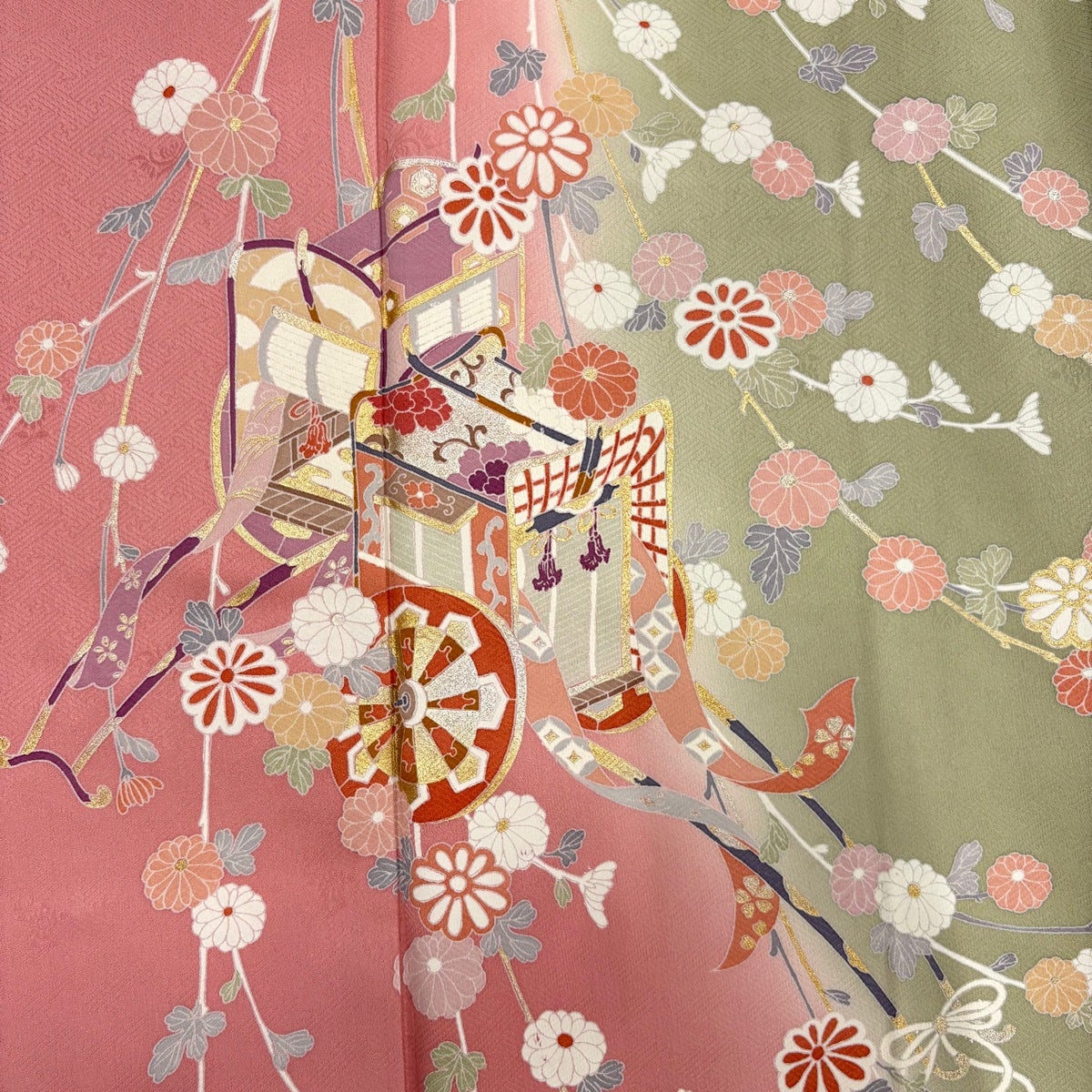 【美品】 訪問着 身丈166cm 裄丈65.5cm M 袷 御所車 菊 金銀彩 染め分け ピンク 正絹 秀品
