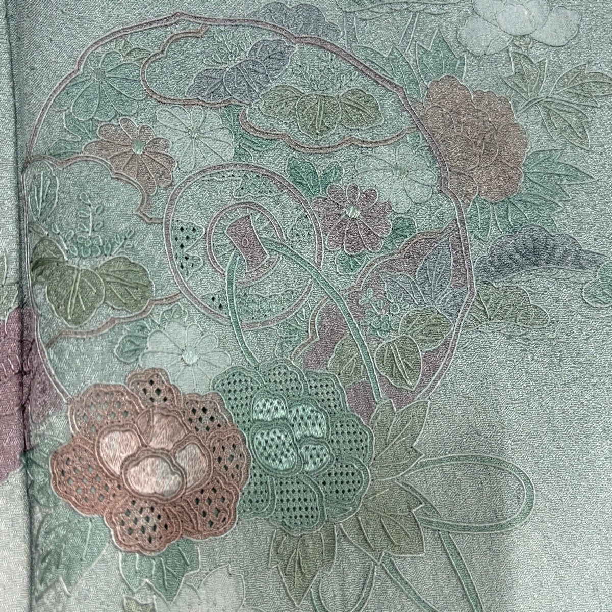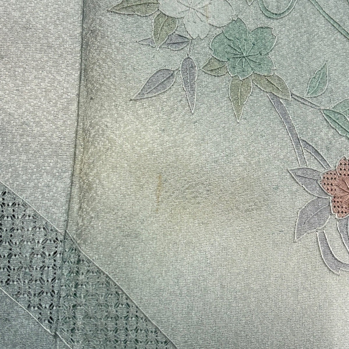 他の画像を見る 【最終価格】 70%OFF 付下げ 身丈158.5cm 裄丈66cm M 袷 紬地 草花 麻の葉 絞り 刺繍 よもぎ色 正絹 名品 K70 当店通常価格 ¥ 13,800 ¥ 4,140 税込