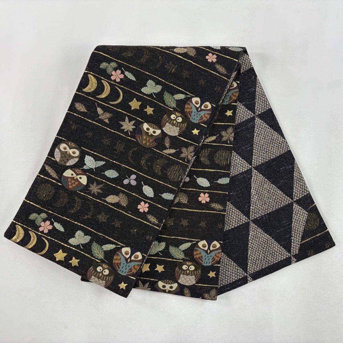 【美品】 袋帯 逸品 ふくろう ミミズク 月 金糸 黒 お太鼓柄 正絹