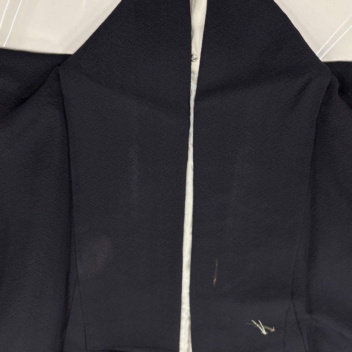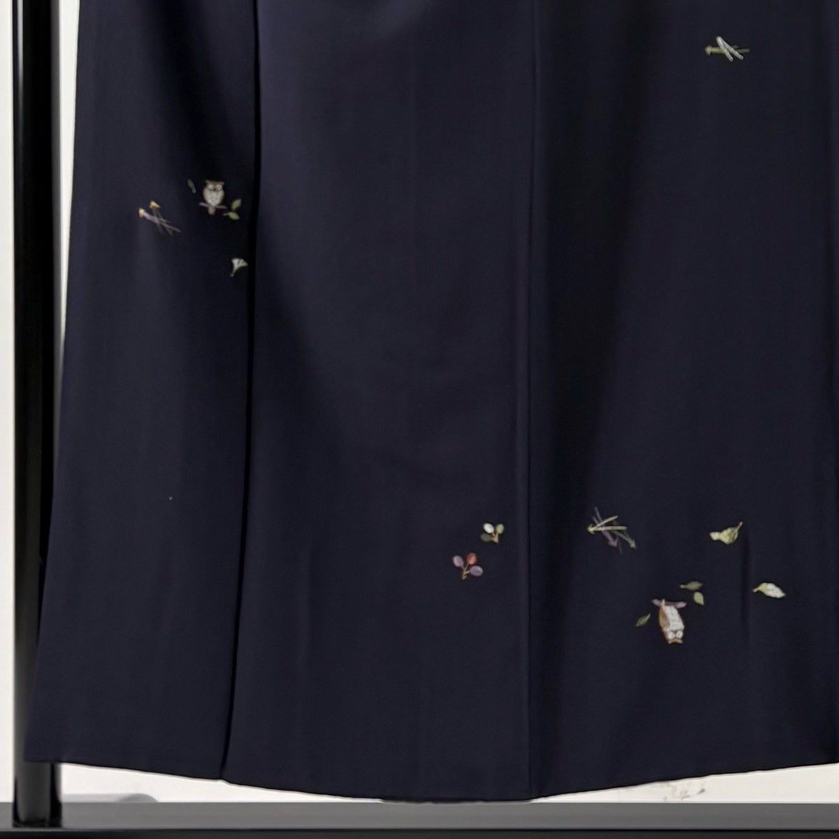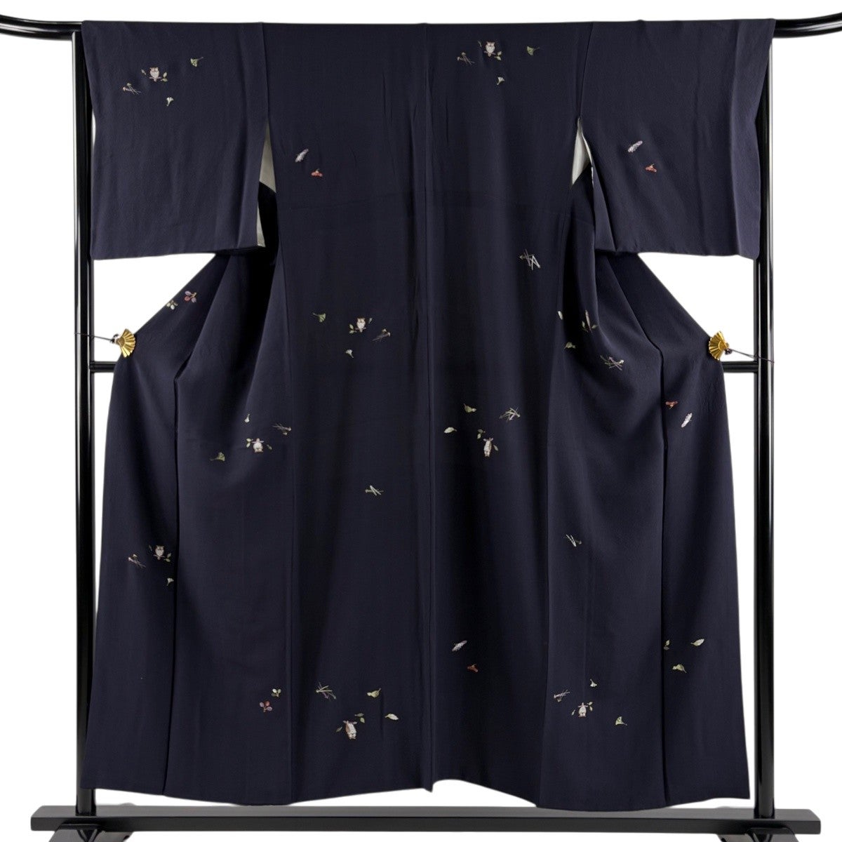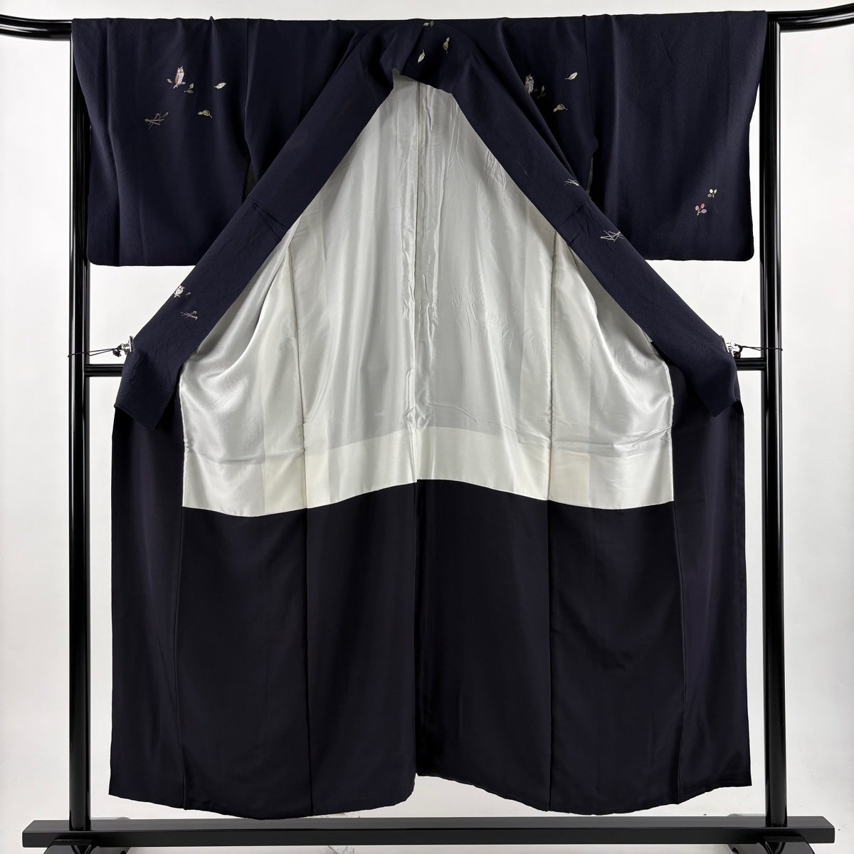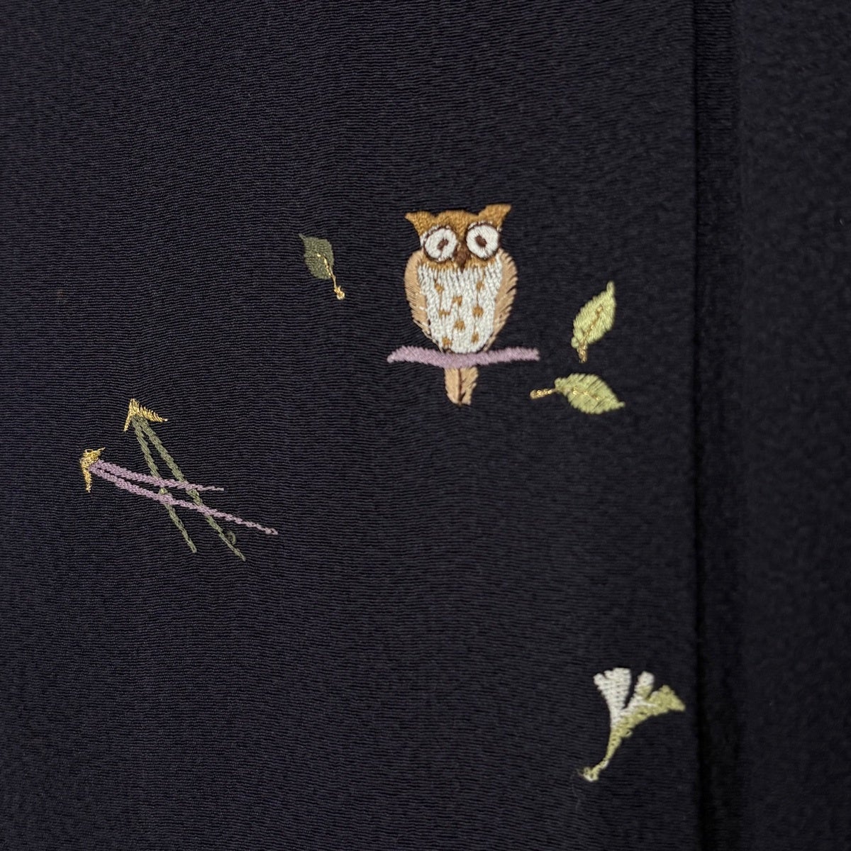 小紋 身丈153cm 裄丈66cm M 袷 ふくろう 松葉 刺繍 金糸 濃紺 正絹 名品