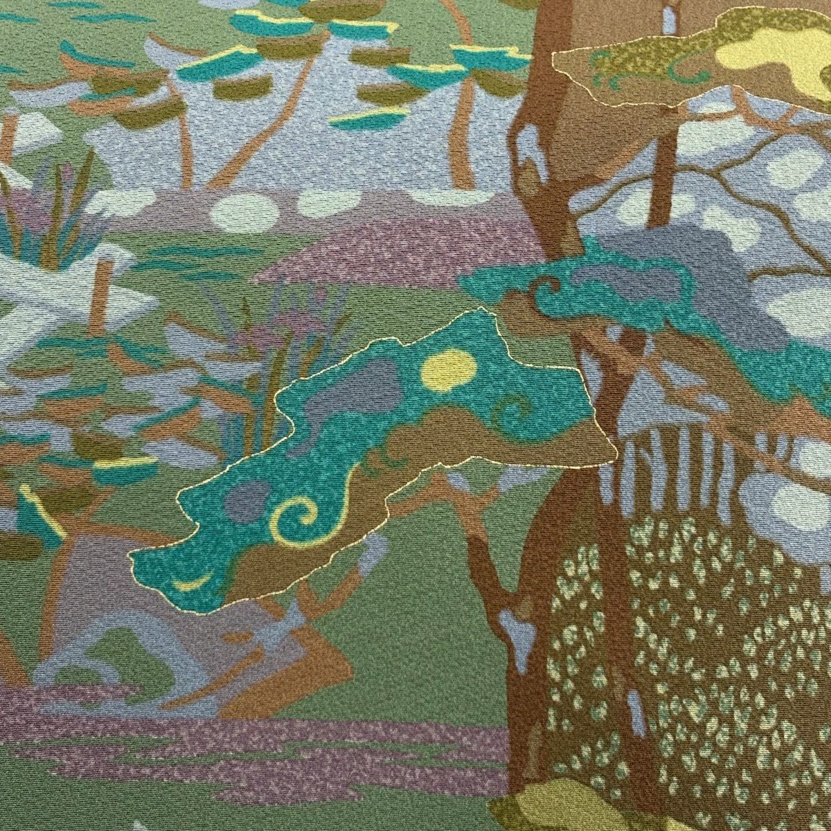 訪問着 身丈168.5cm 裄丈66cm M 袷 鞠 桜 金糸 金彩 よもぎ色 正絹 秀品
