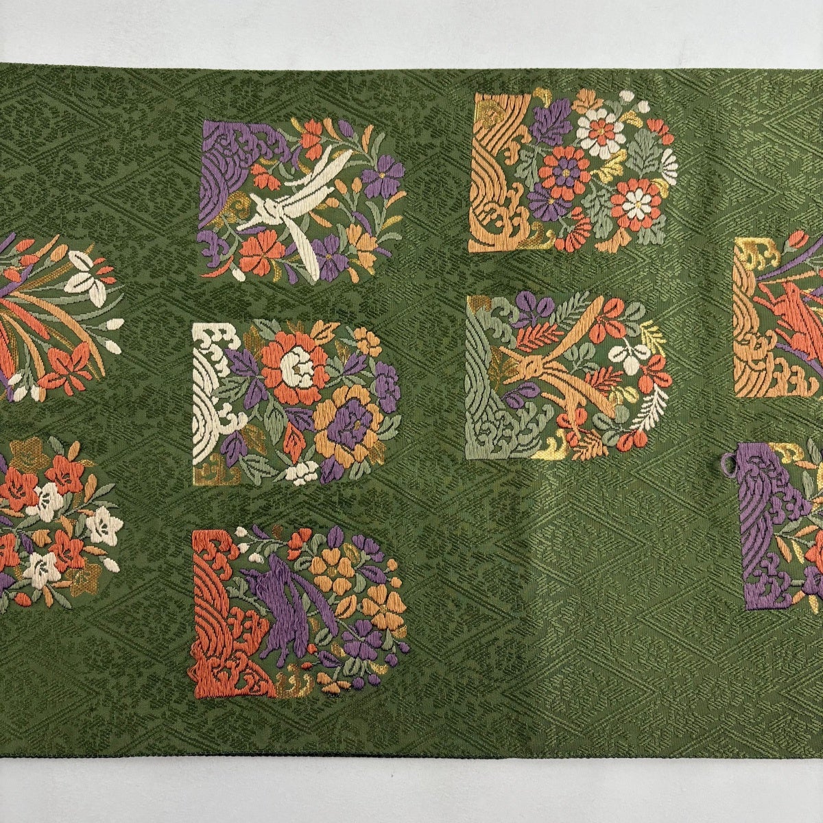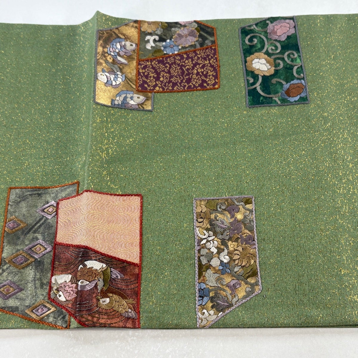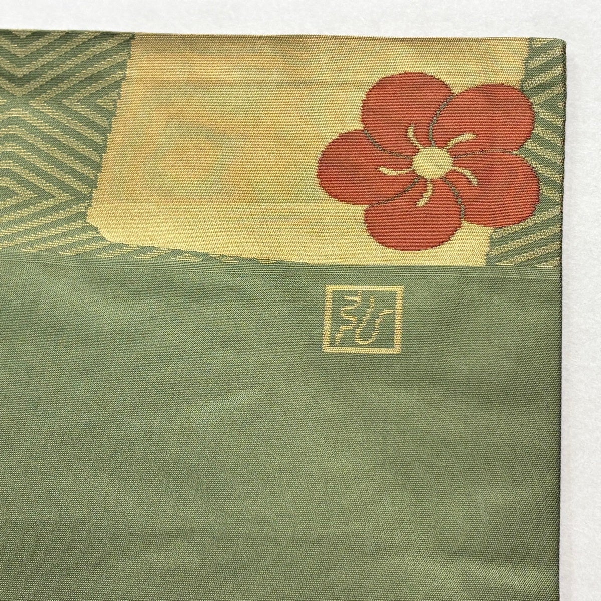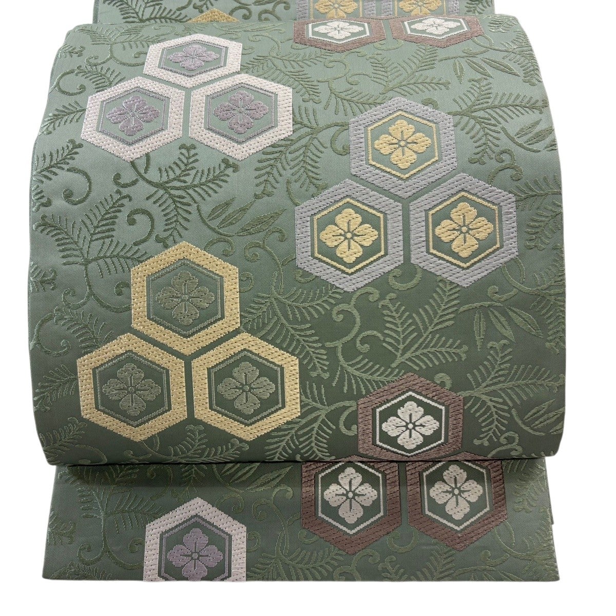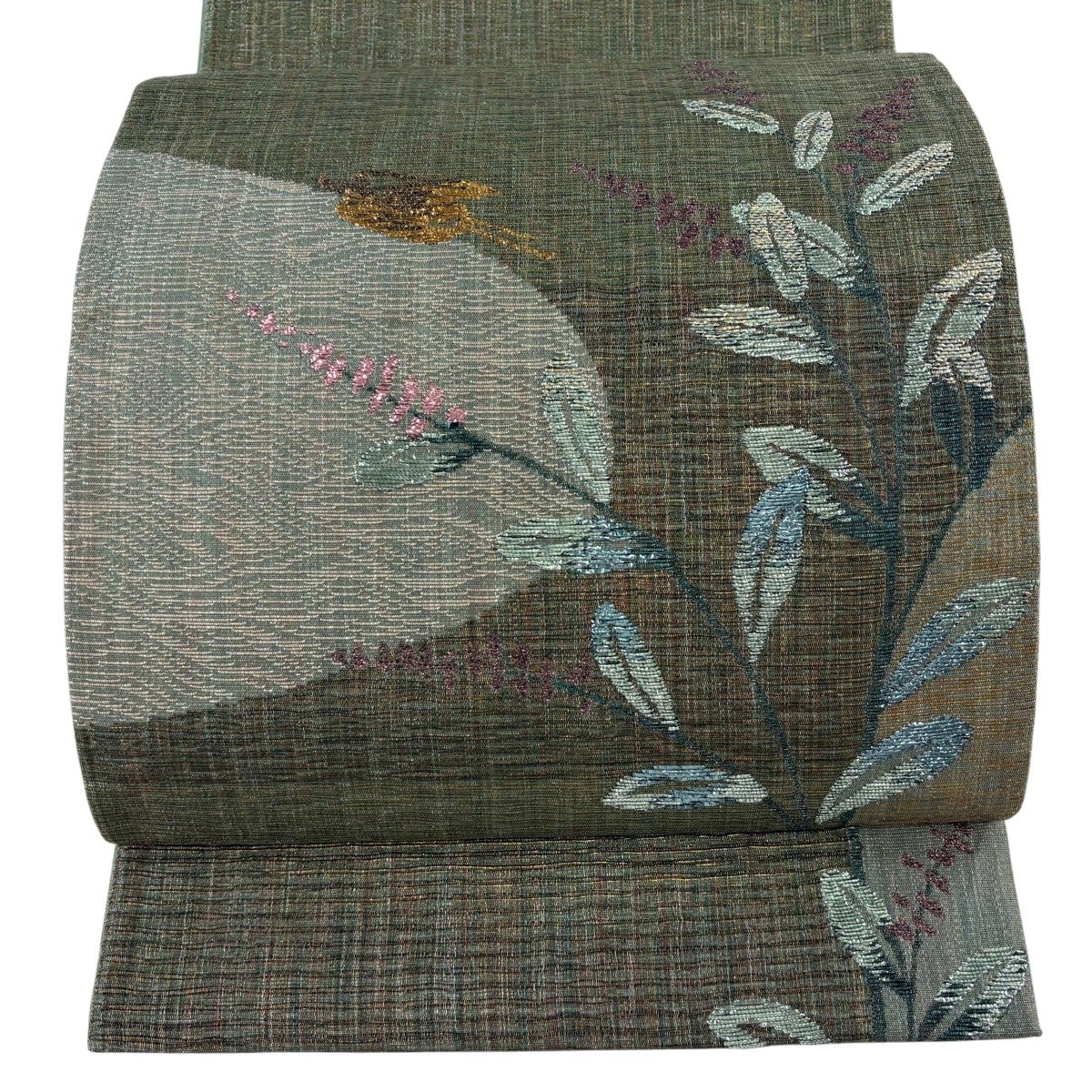 30%OFF 【美品】 袋帯 秀品 冊子 草花 金糸 箔 よもぎ色 六通 正絹 K30