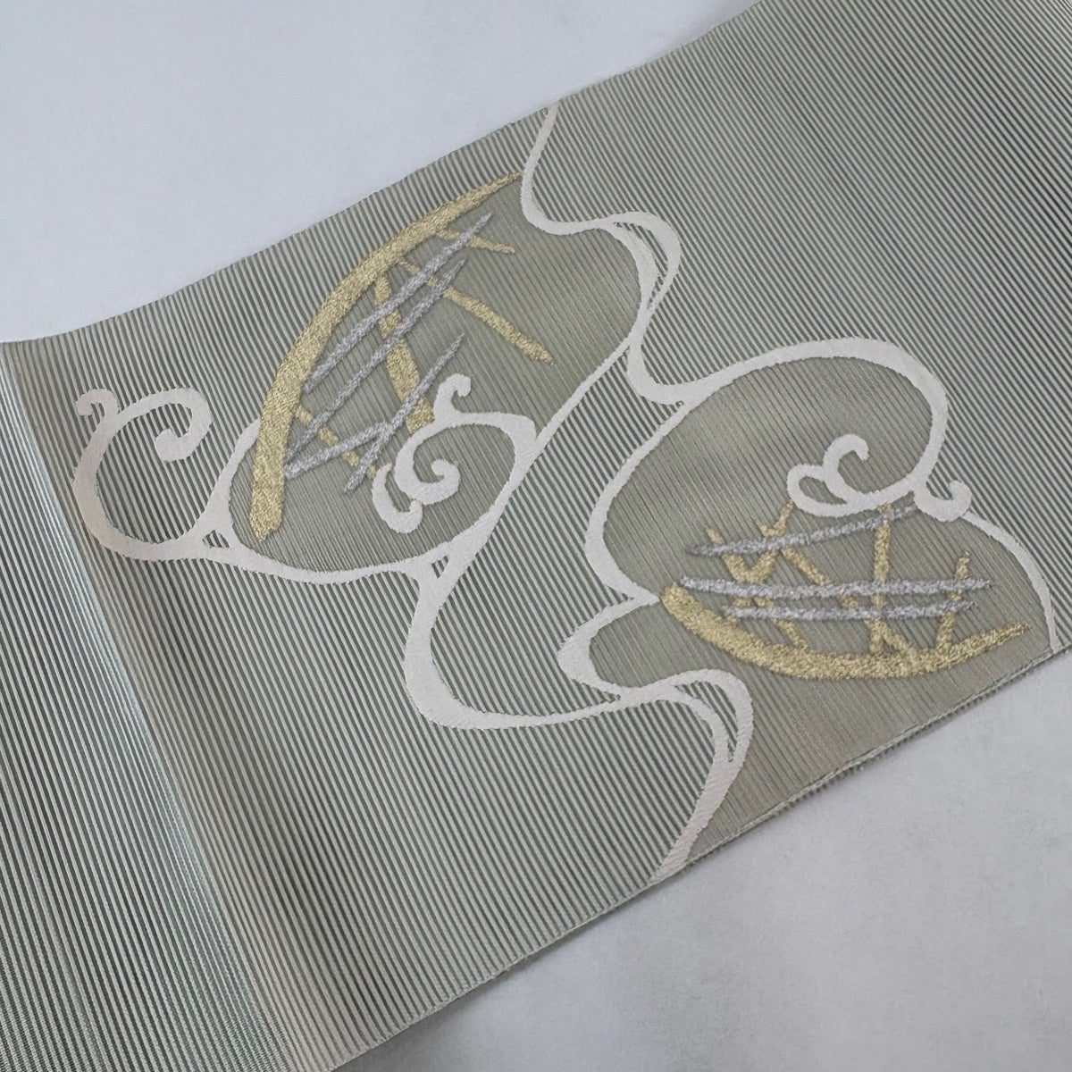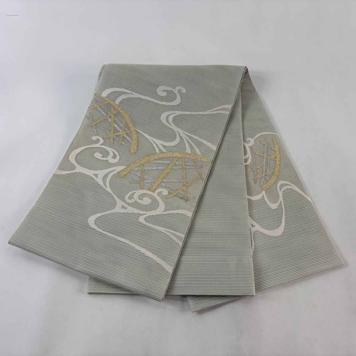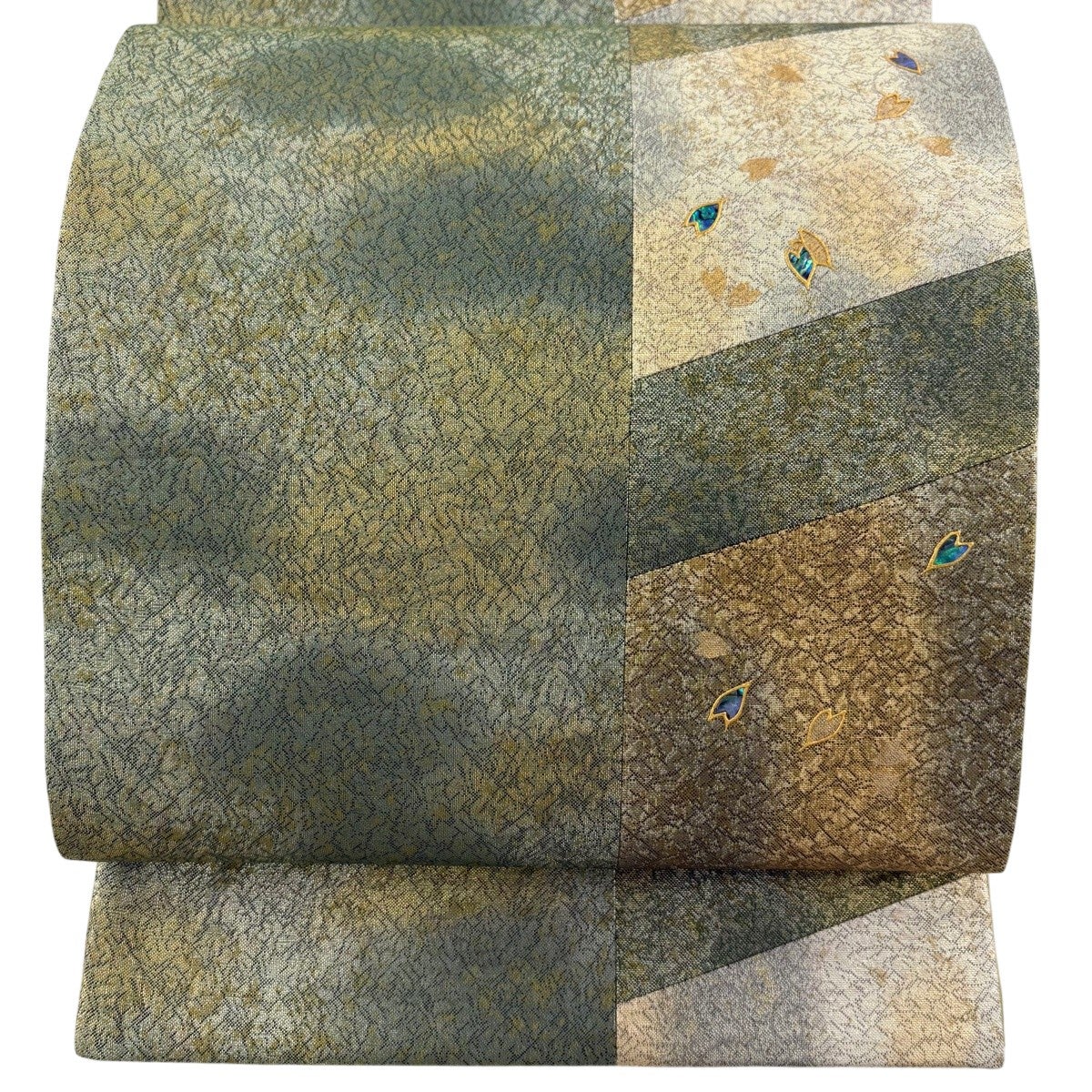 30%OFF 【美品】 袋帯 秀品 落款あり 霞 市松模様 箔 よもぎ色 六通 正絹 K30