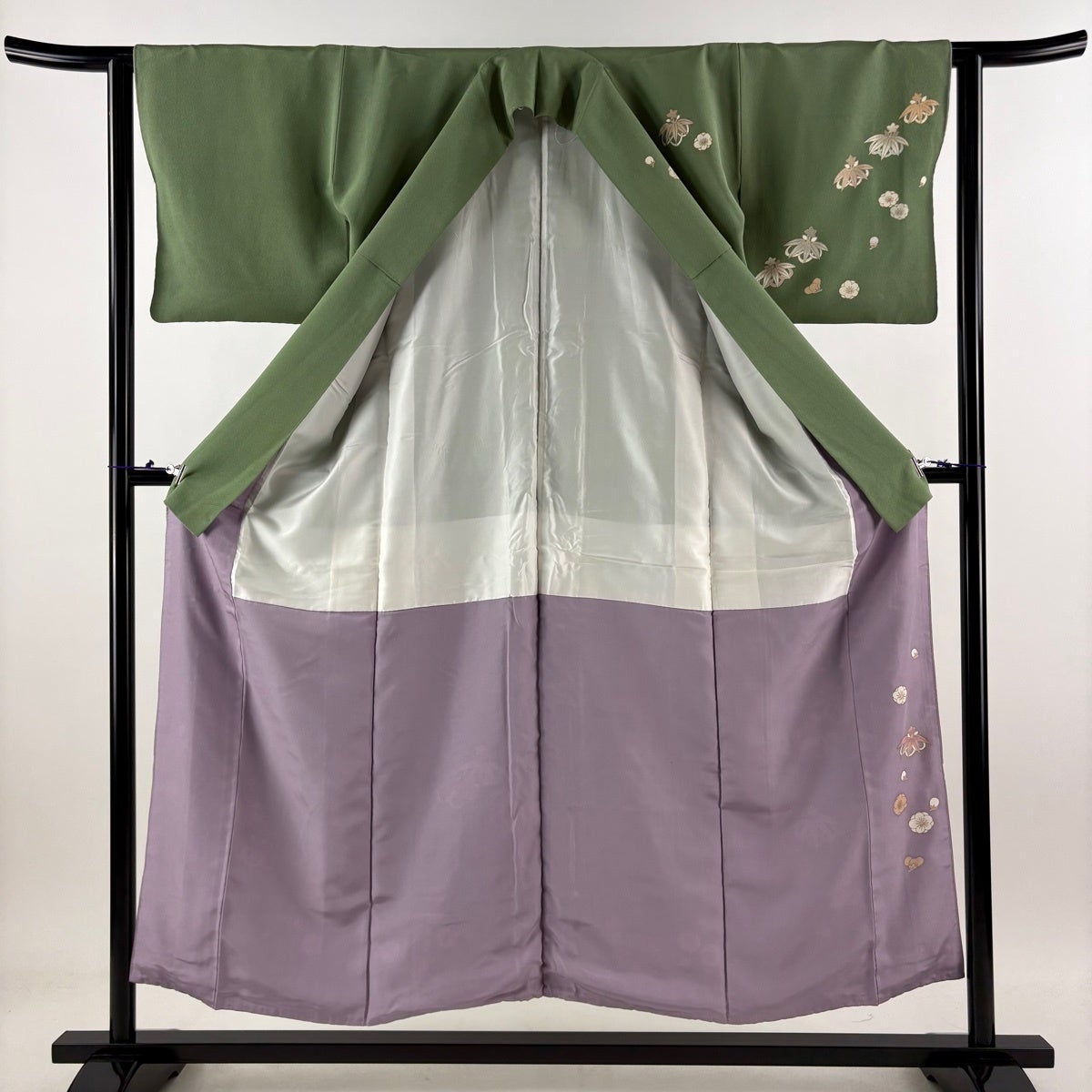 付下げ 身丈156cm 裄丈61cm S 袷 草花 霞 刺繍 金銀彩 よもぎ色 正絹 秀品