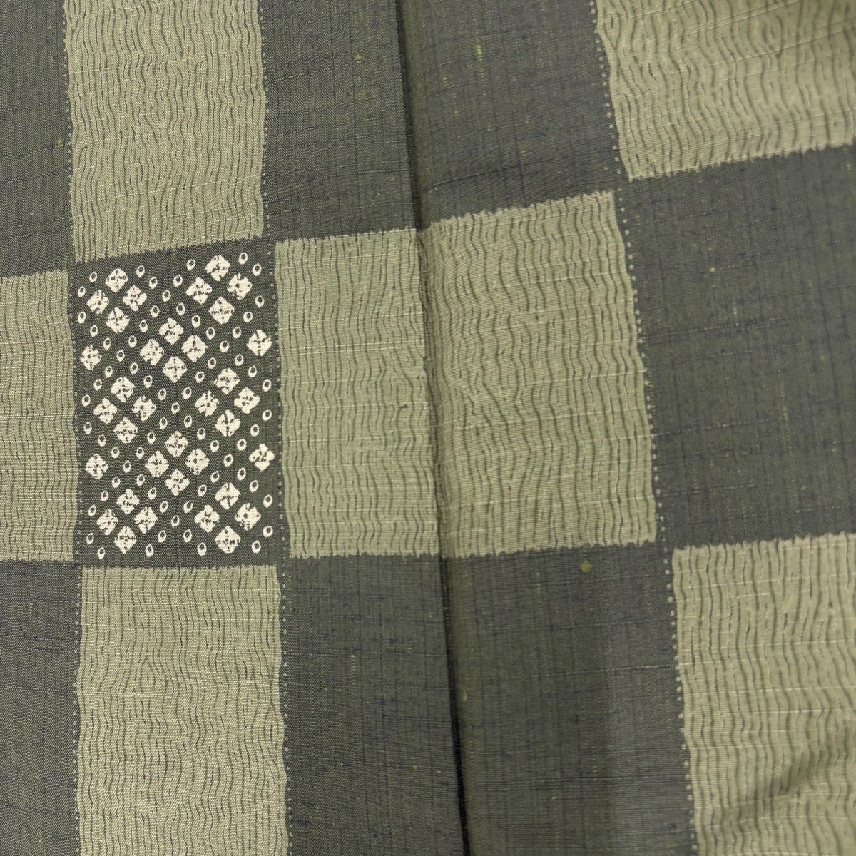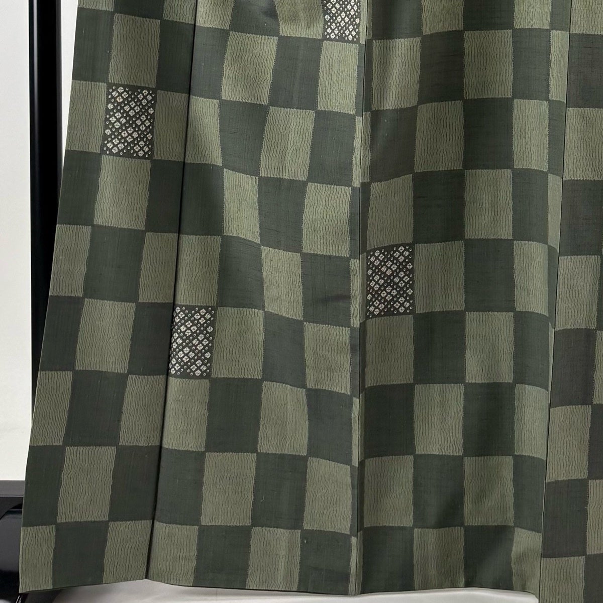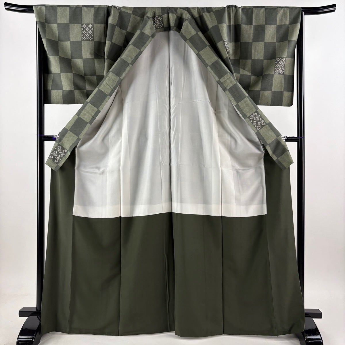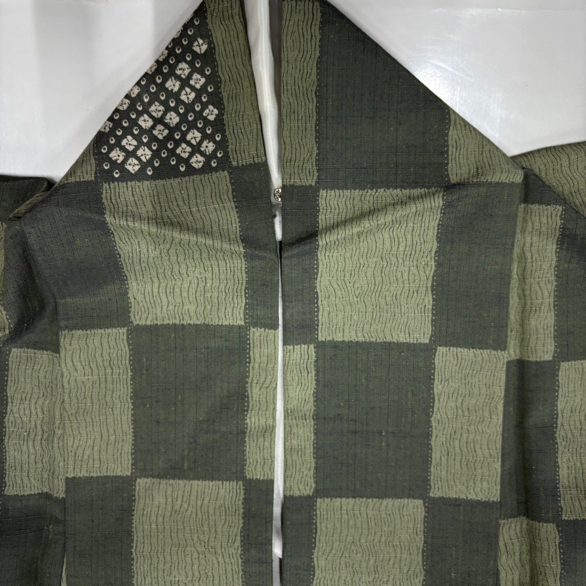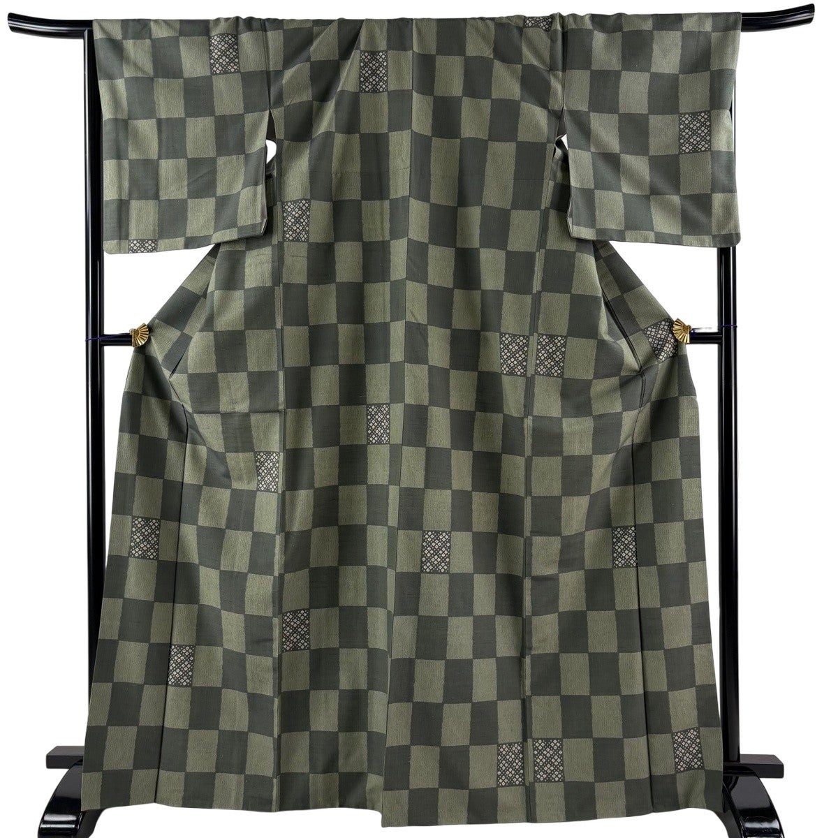 【美品】 小紋 身丈168.5cm 裄丈68cm L 袷 紬地 市松 菱 よもぎ色 正絹 秀品