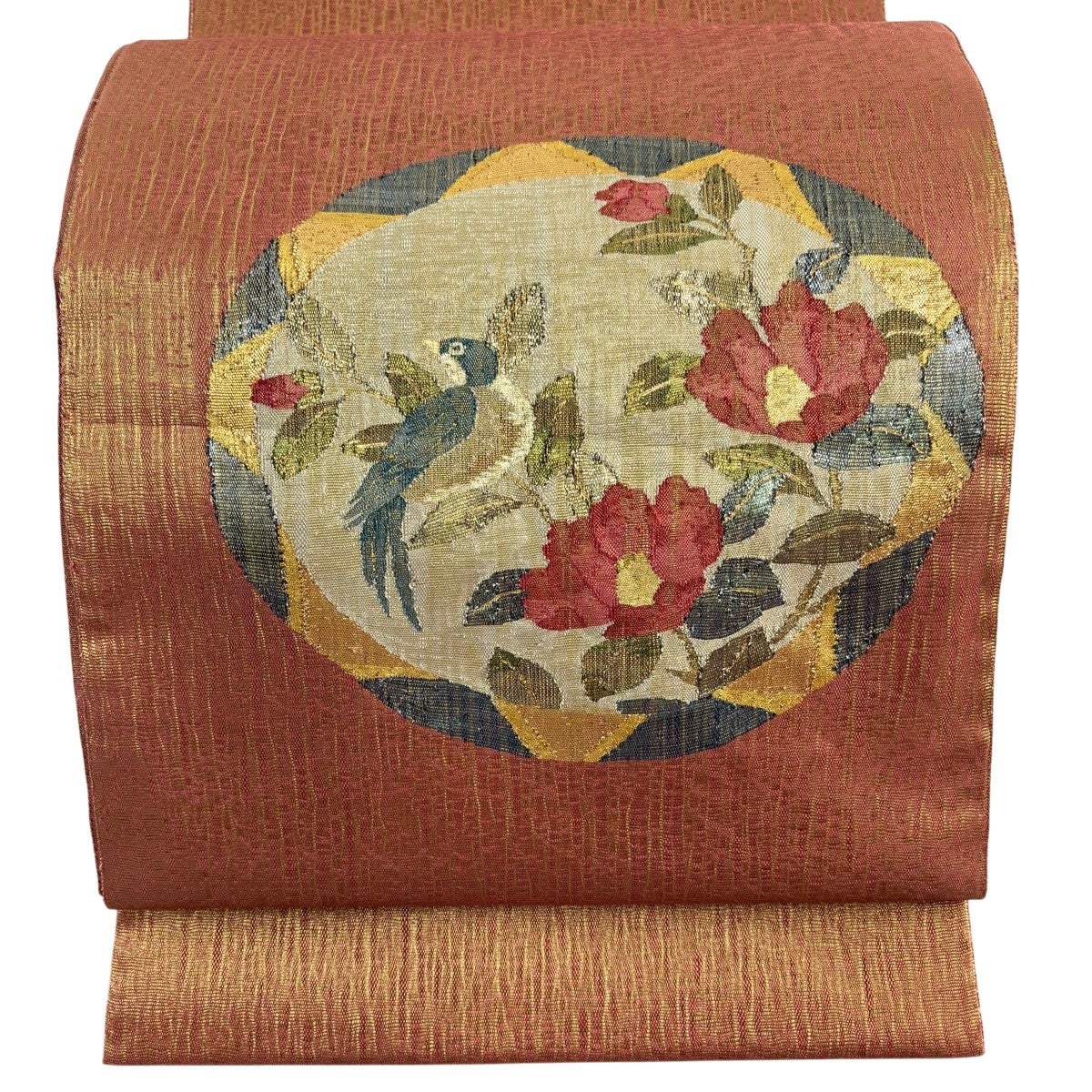 【美品】 名古屋帯 秀品 蜀江文 鳥 刺繍 箔 オレンジ 正絹
